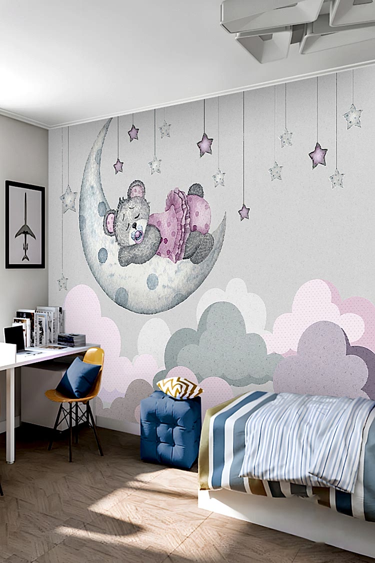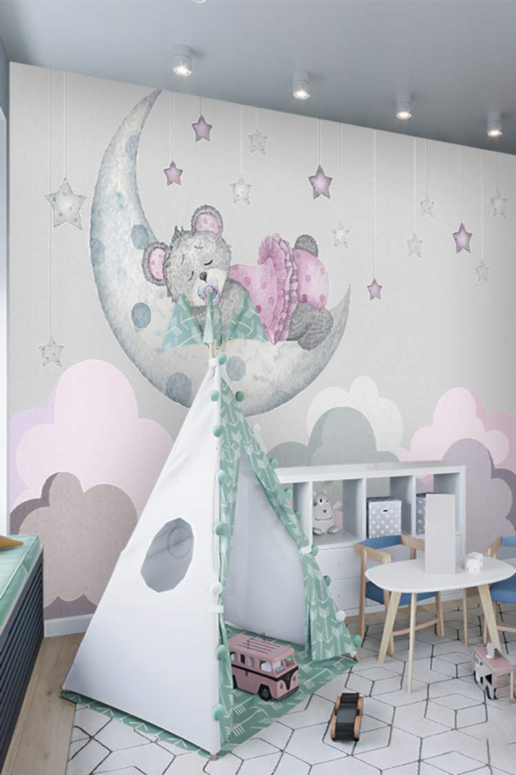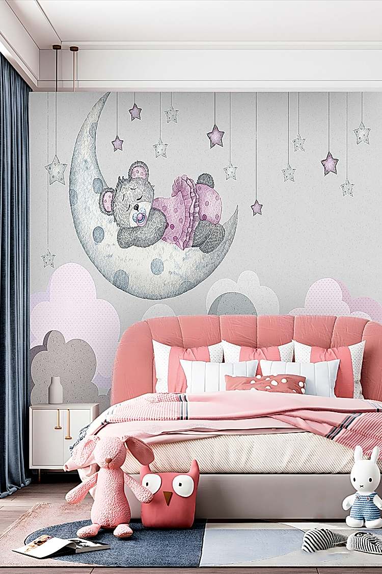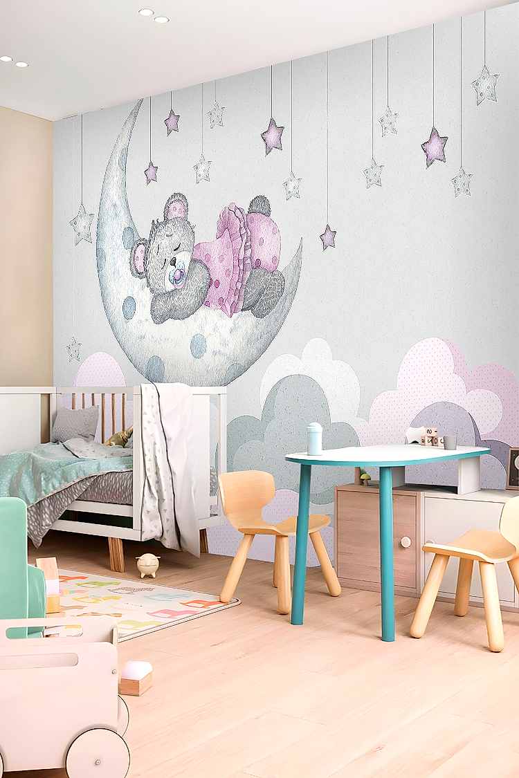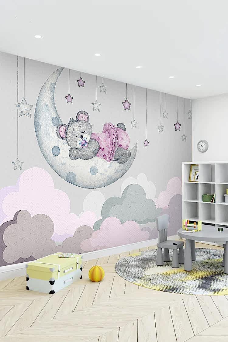 Ay ve Yıldızlarla Uyuyan Ayıcık Duvar Kağıdı
