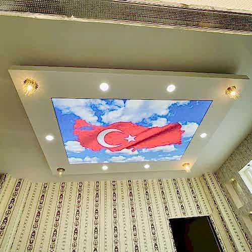 Bayrak desenli gergi tavanlar, mekanınıza estetik bir görünüm kazandırır. Farklı bayrak motifleri, renk kombinasyonları ve tasarımlar ile mekanınıza özgün bir hava katabilirsiniz. Bu tür dekorasyon, özellikle geniş alanlarda etkileyici bir görsellik sunar.