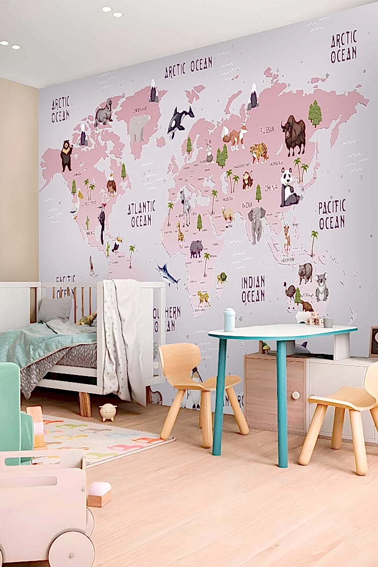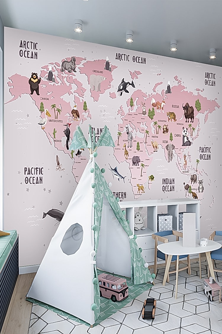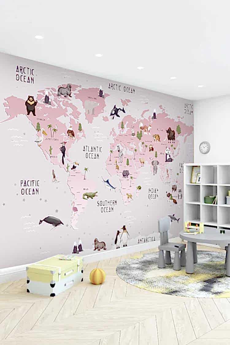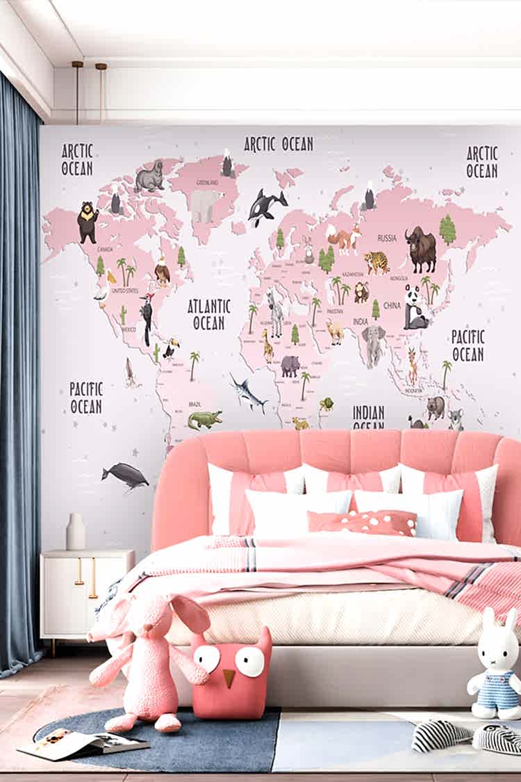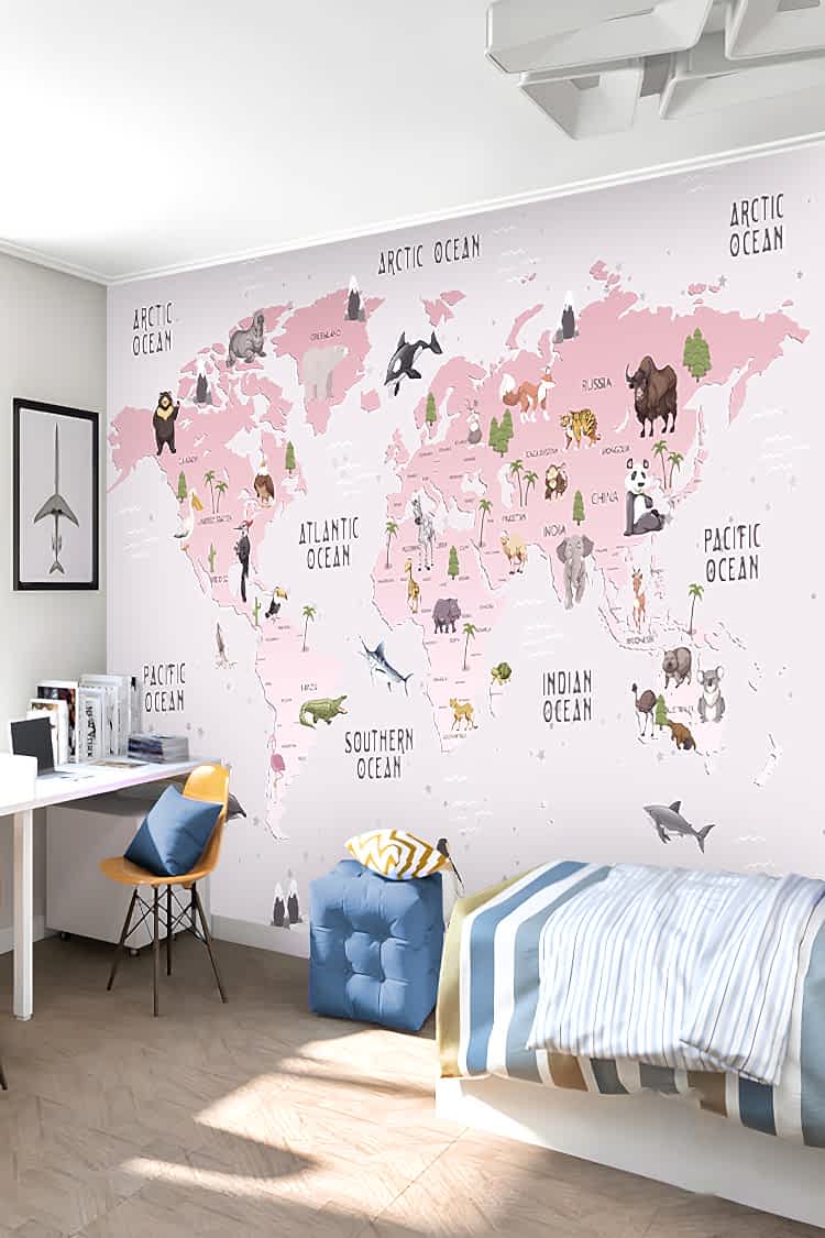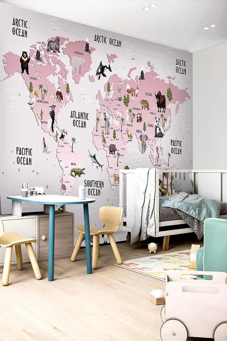 Çocuklar İçin Dünya Haritası ve Hayvanlar Duvar Kağıdı