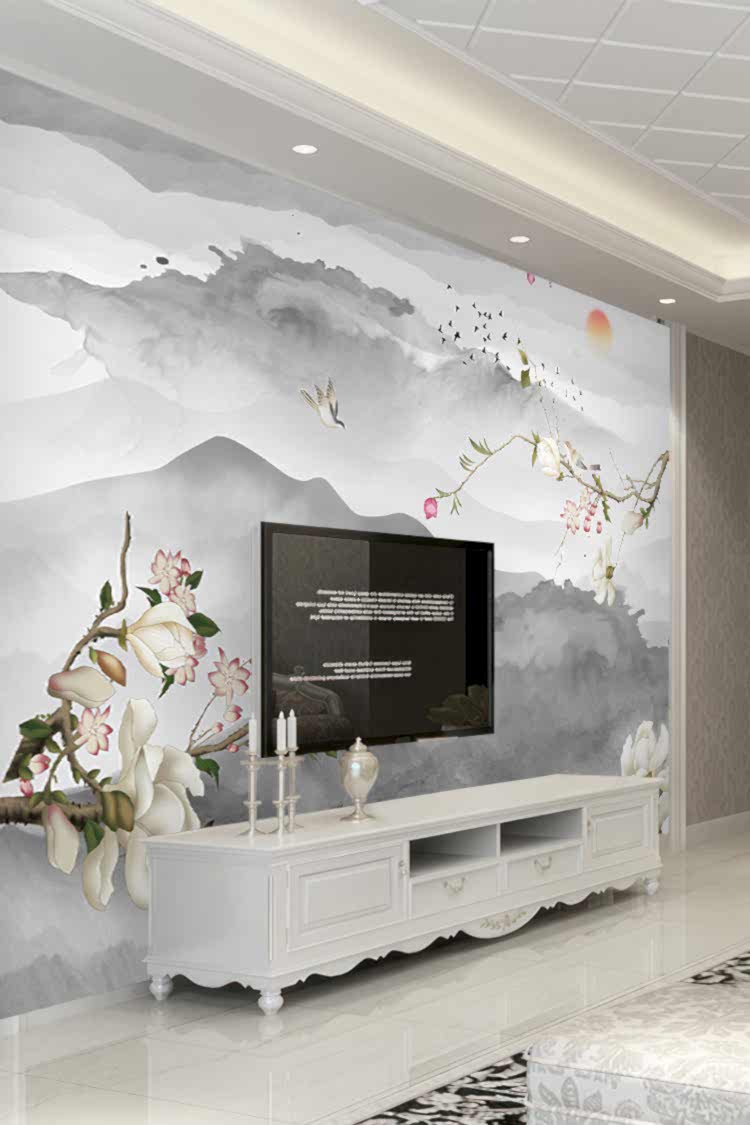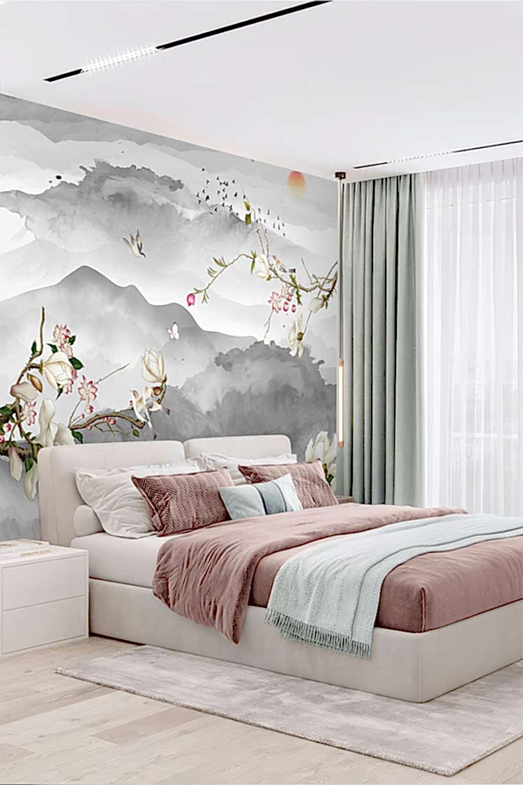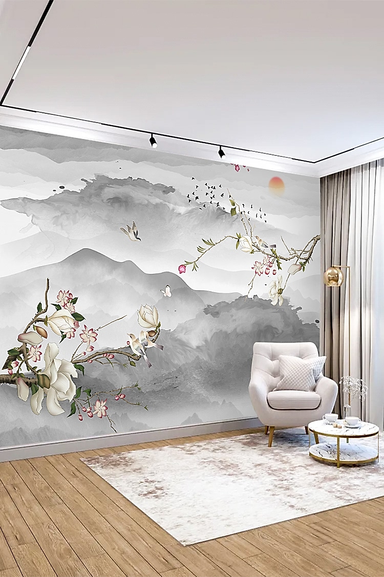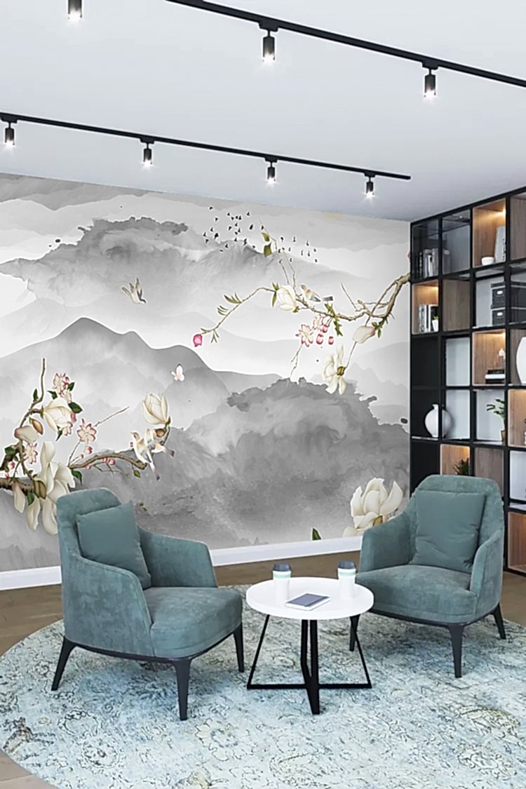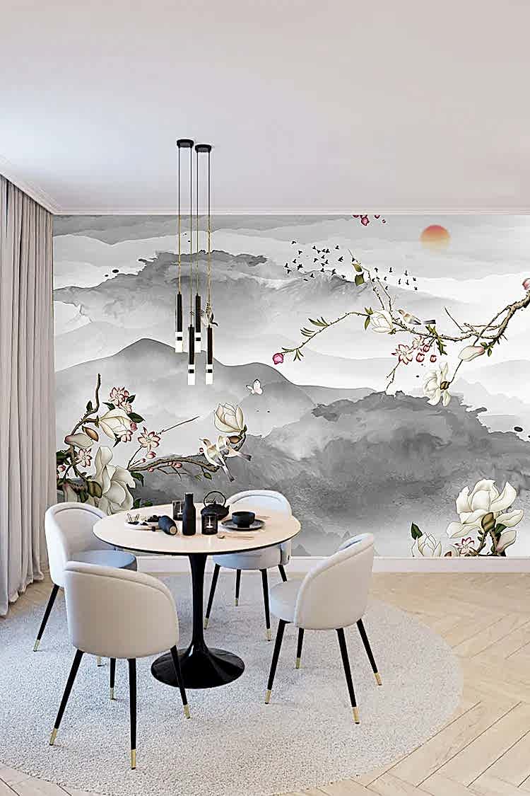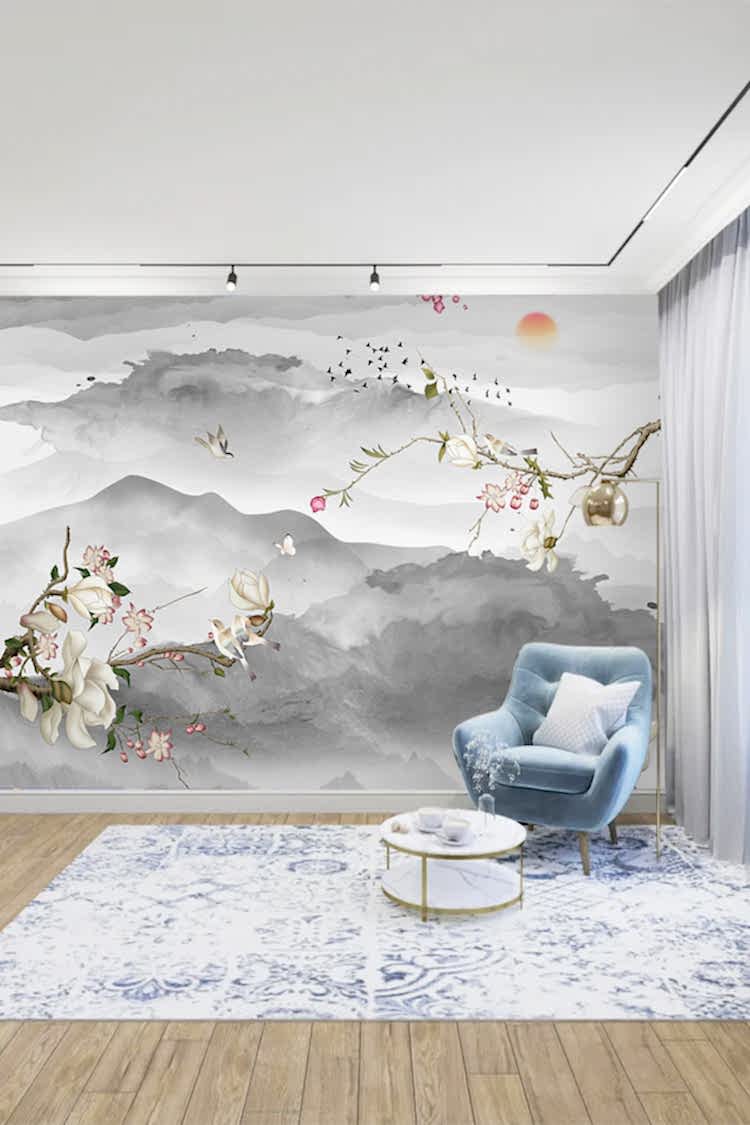Dağ Manzaralı Çiçekli Duvar Kağıdı
