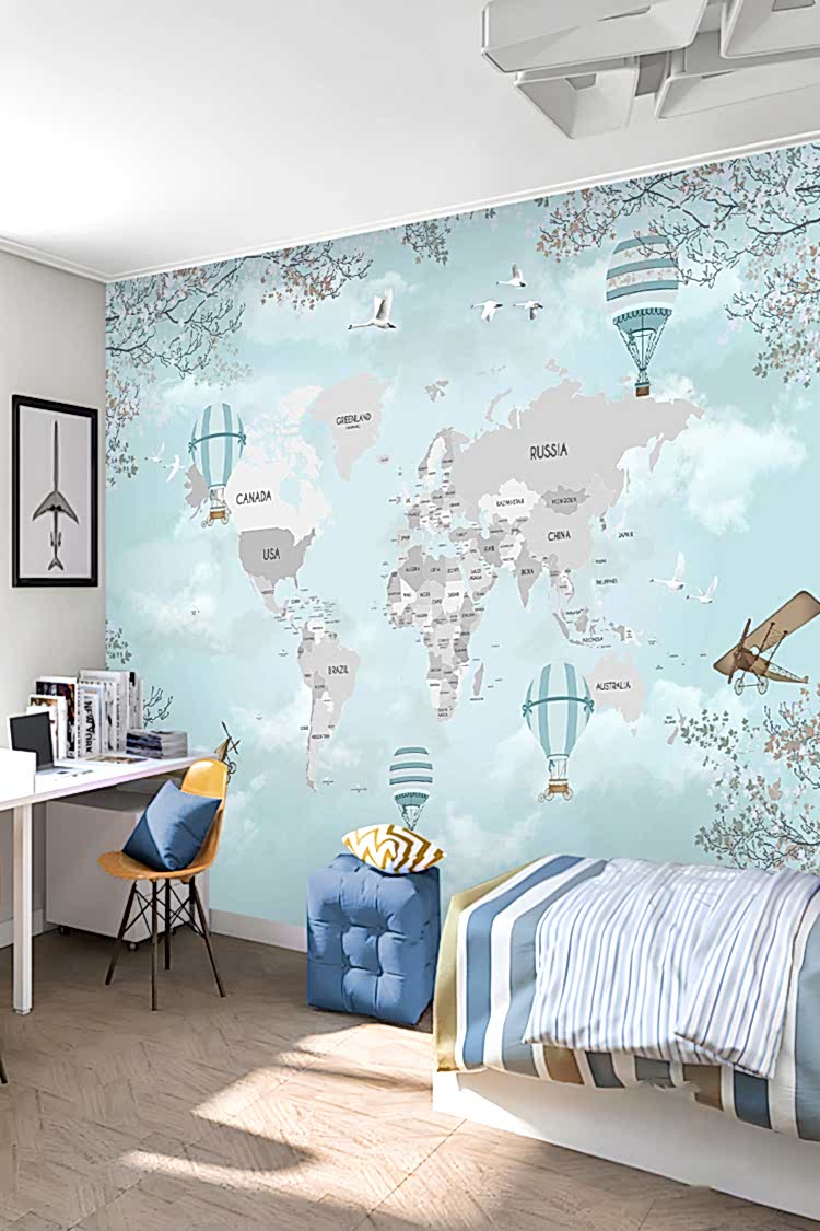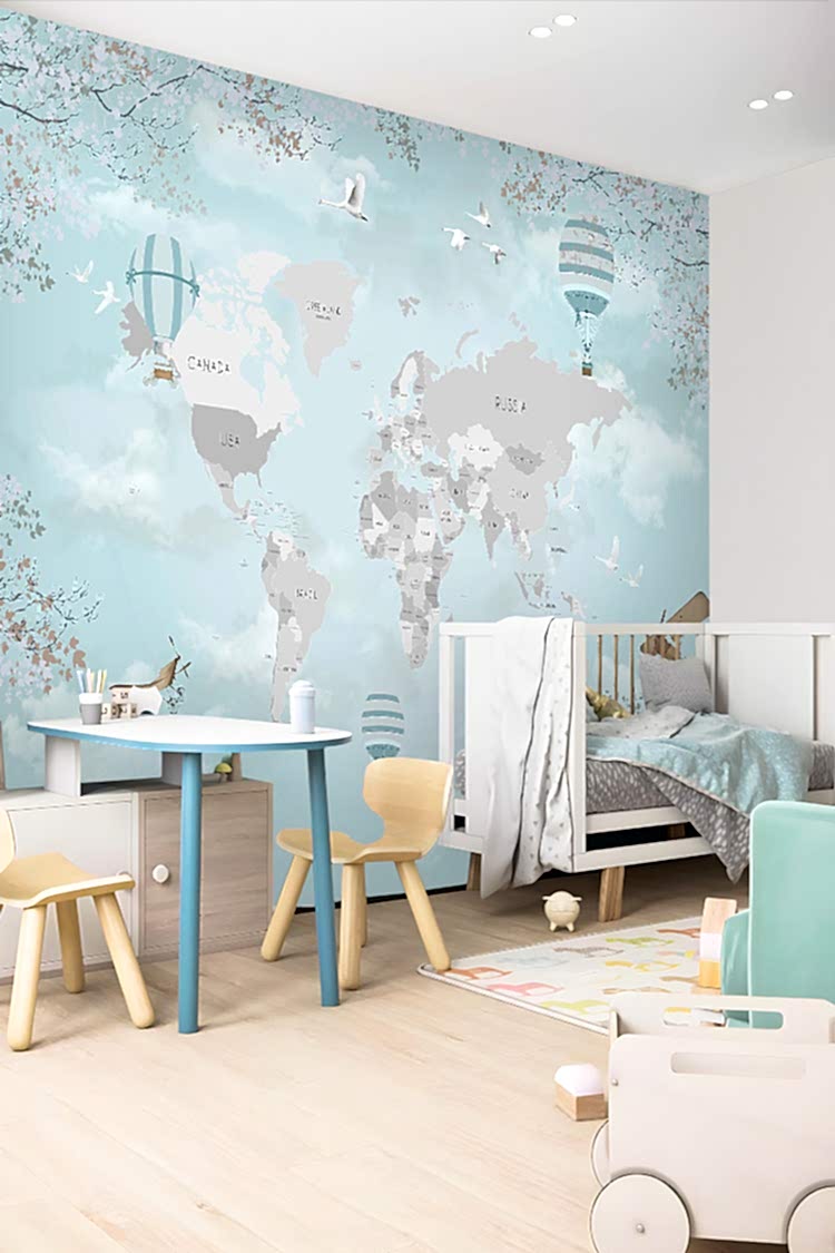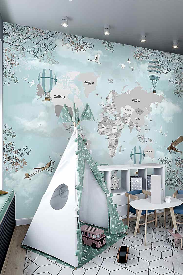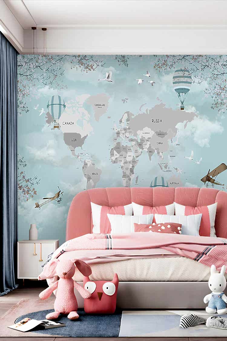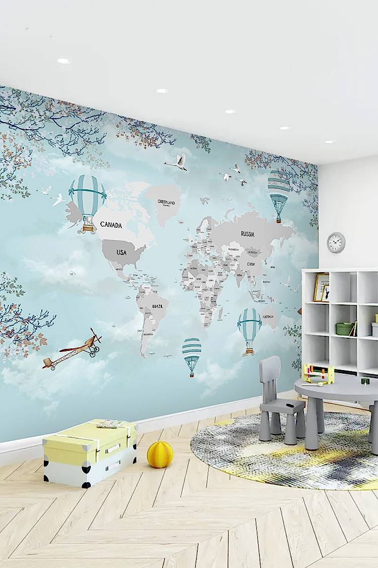 Dünya Haritası ve Balonlar Temalı Duvar Kağıdı