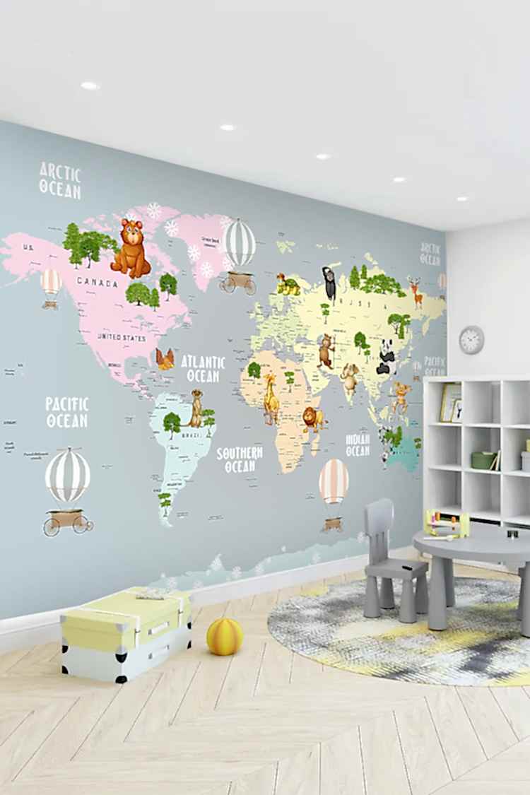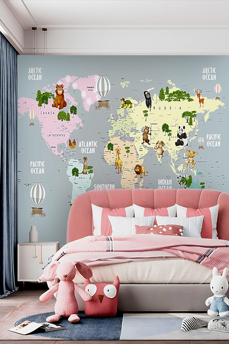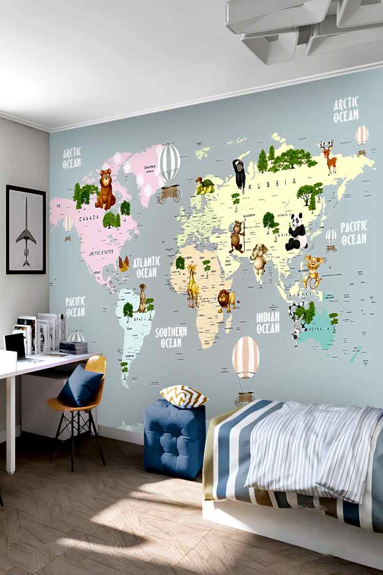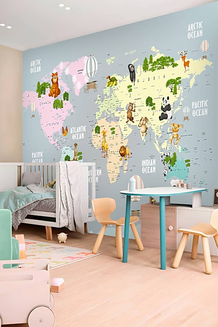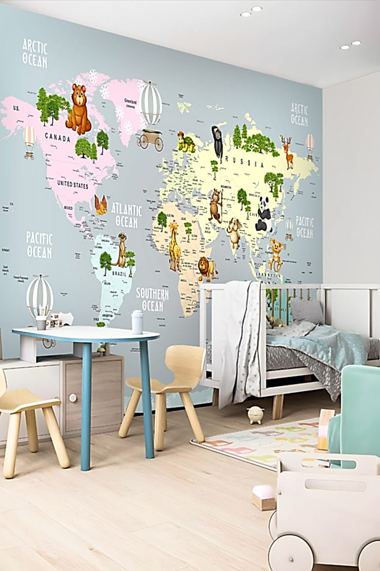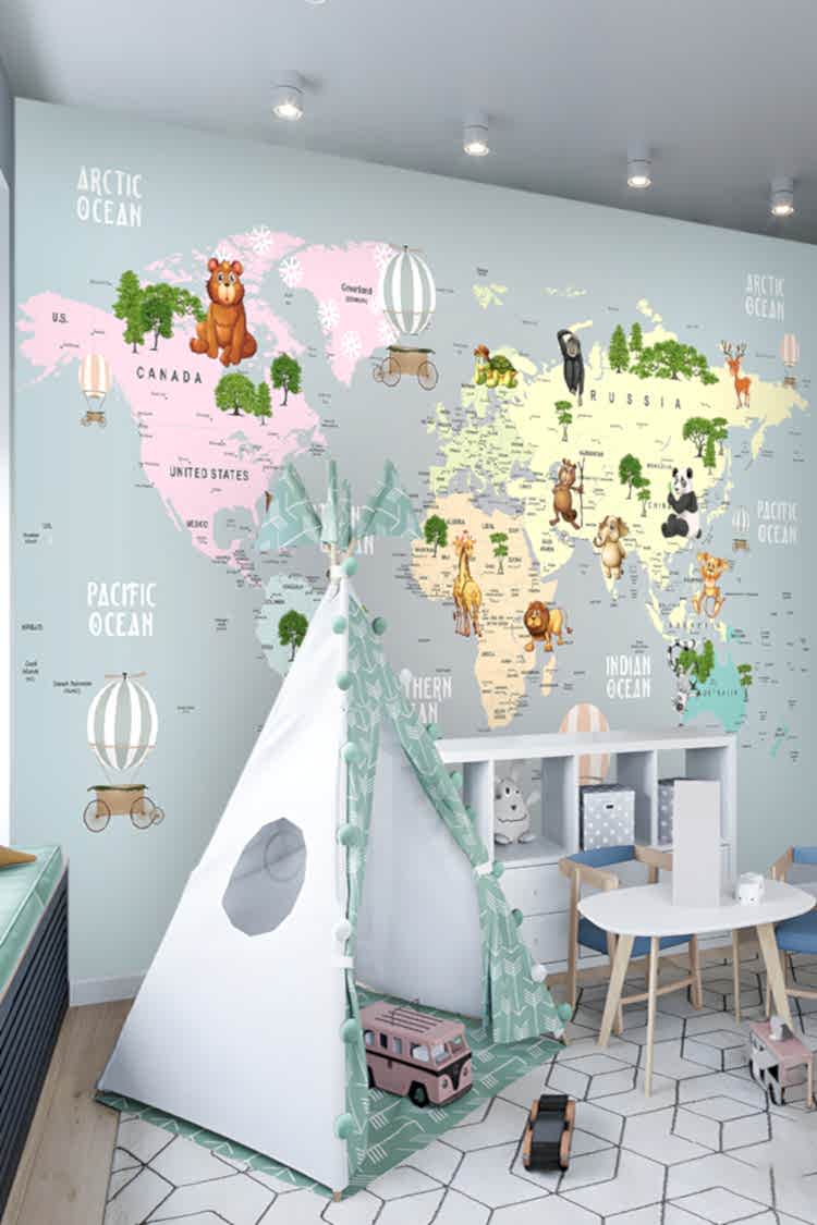 Dünya Haritası ve Hayvanlar Temalı Duvar Kağıdı