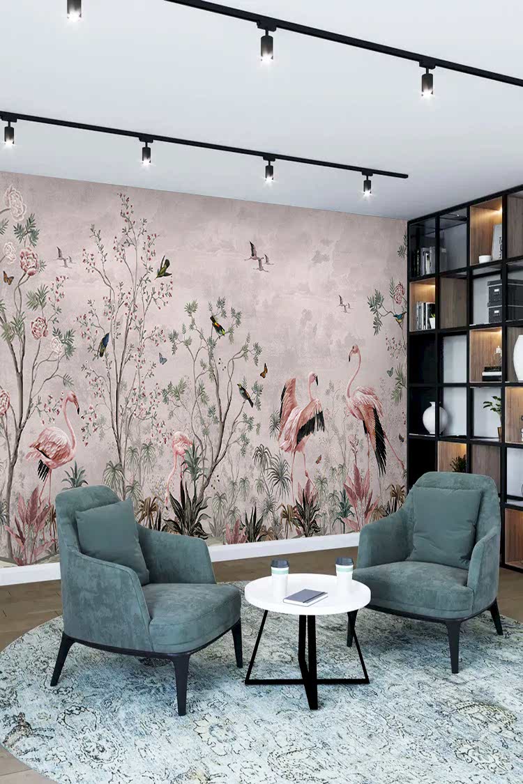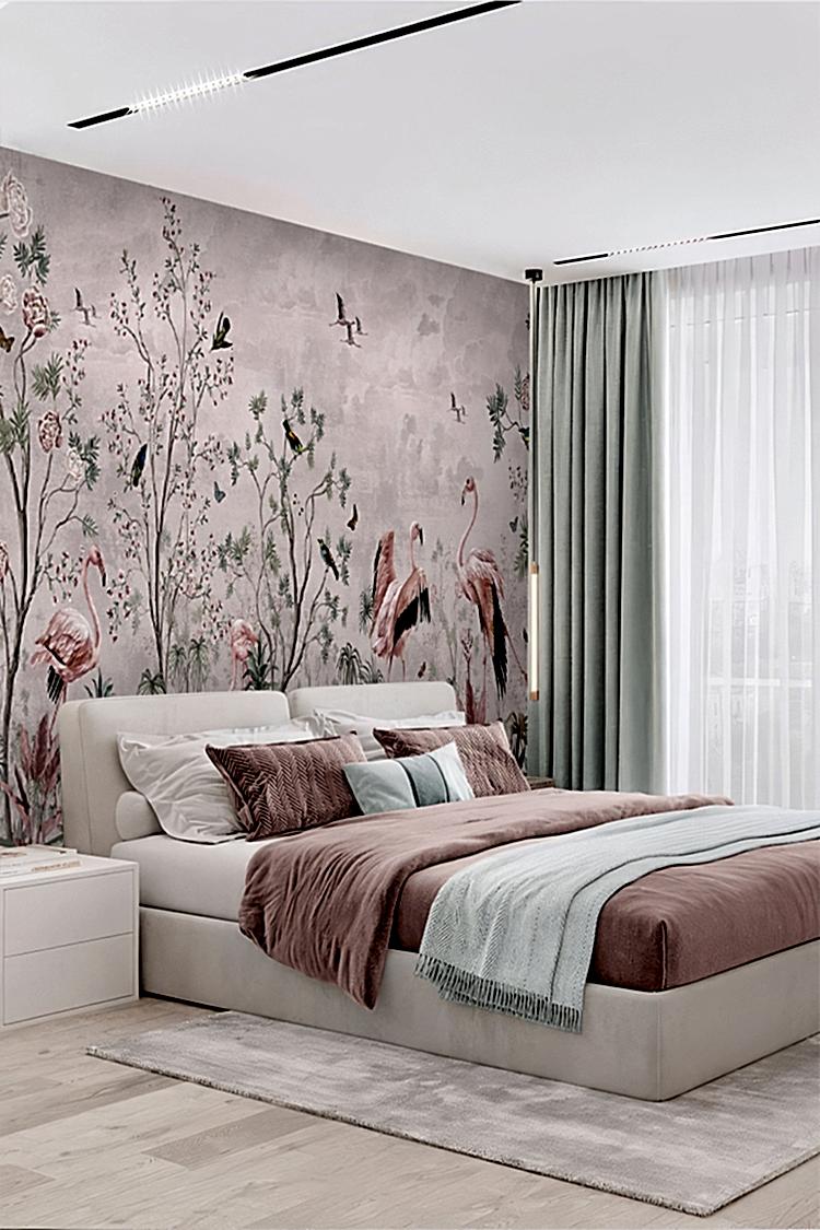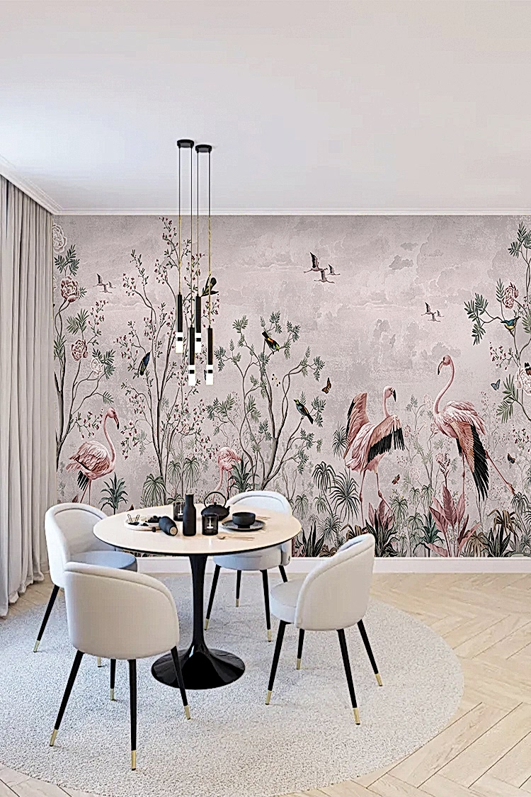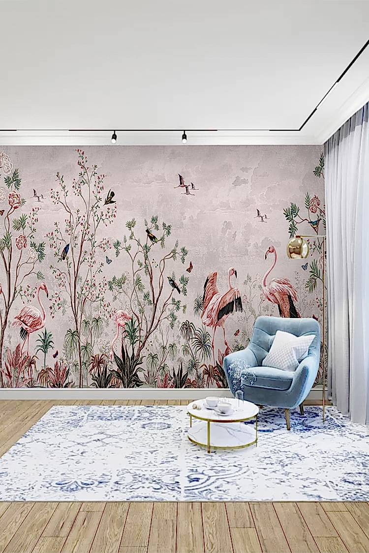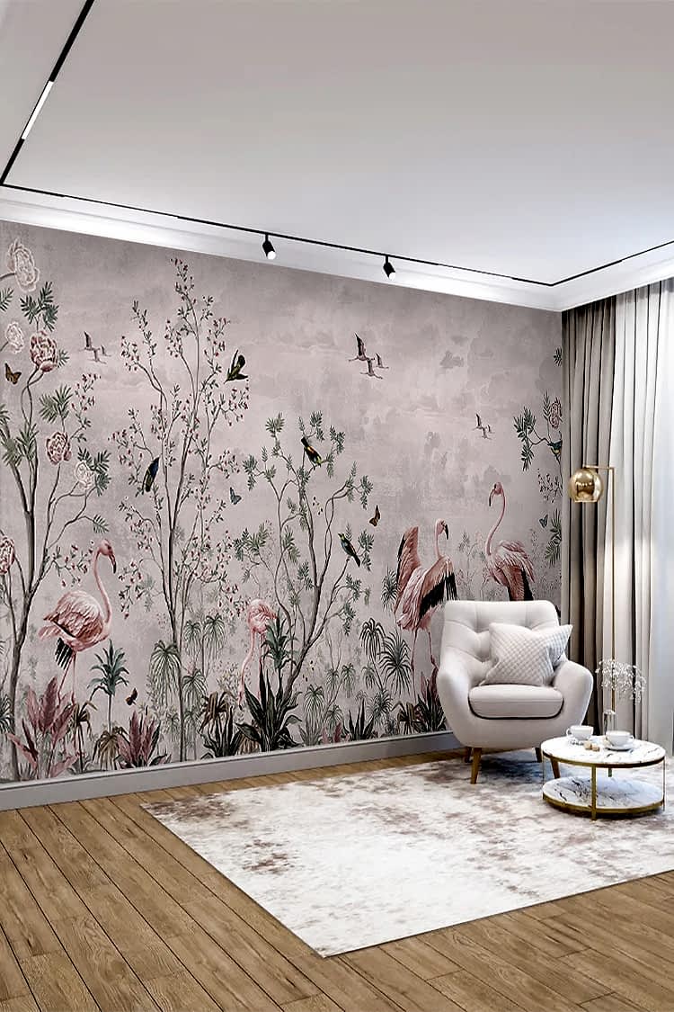 Flamingo ve Doğal Çiçek Desenli Duvar Kağıdı