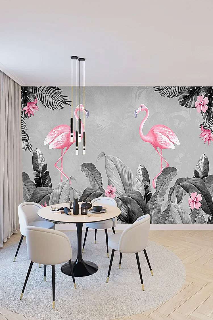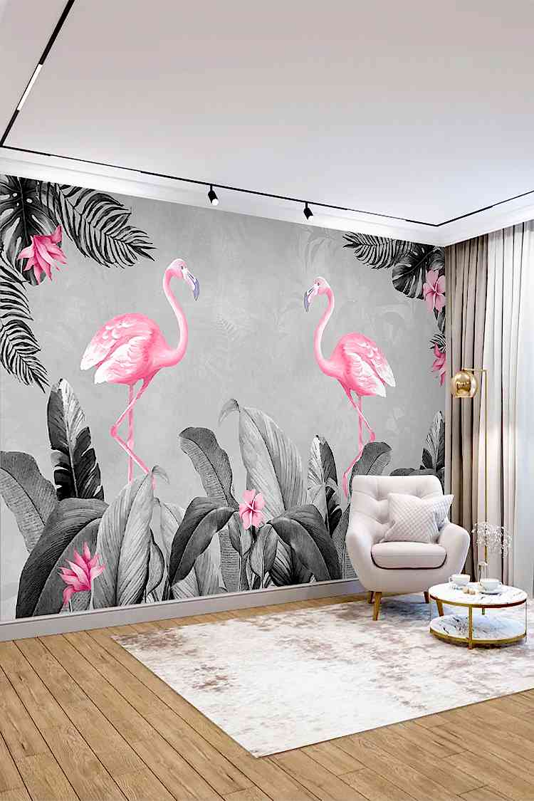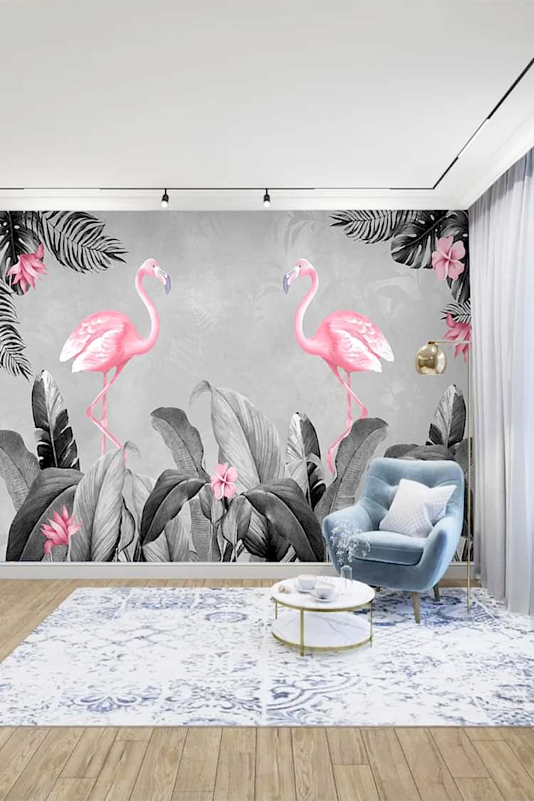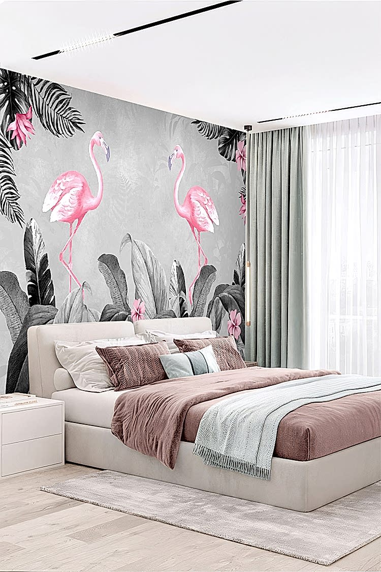 Flamingo ve Tropikal Yaprak Desenli Duvar Kağıdı