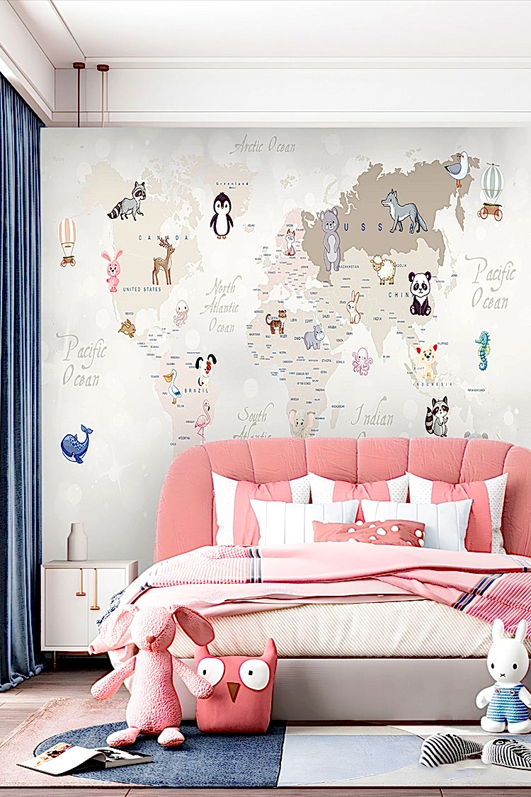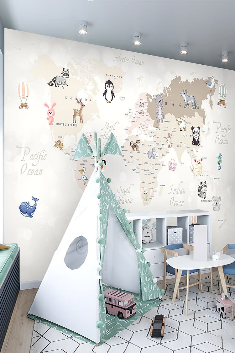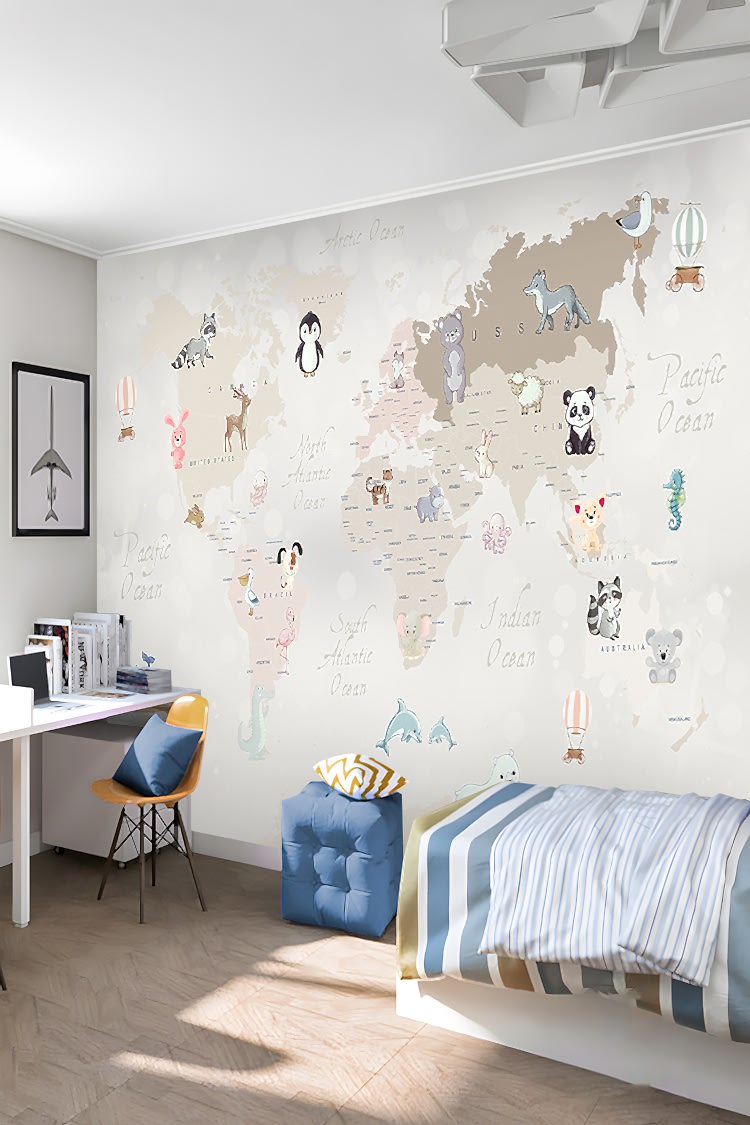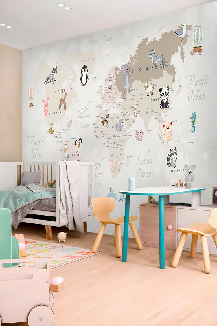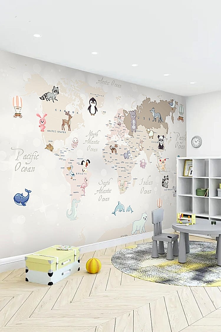 Hayvanlar ve Dünya Haritası Temalı Duvar Kağıdı