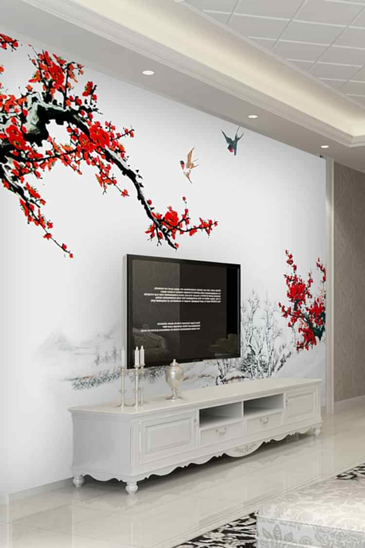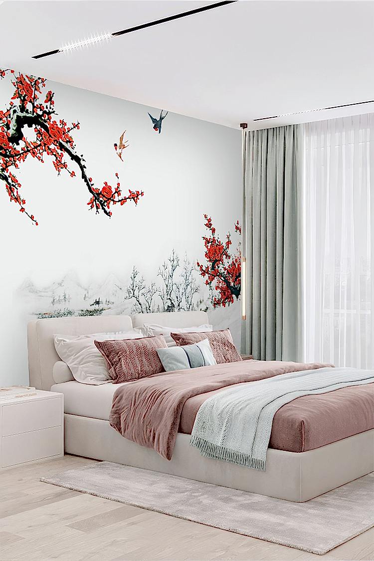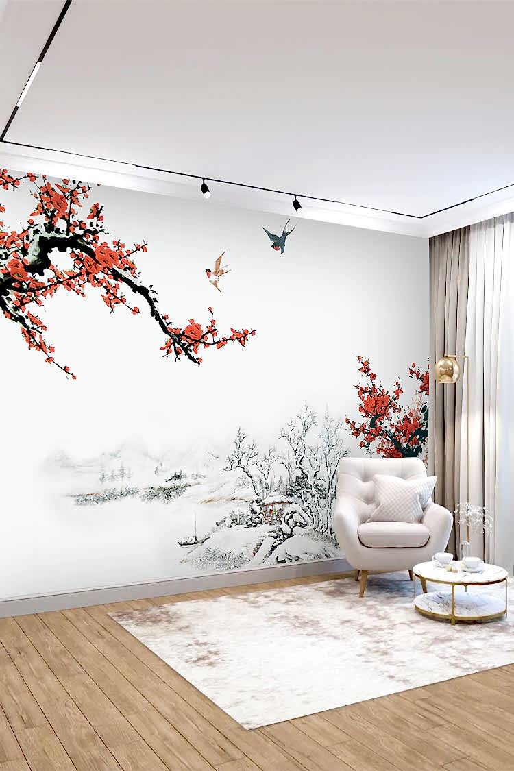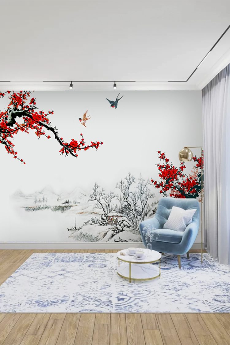 Kiraz Çiçekli Kış Manzaralı Duvar Kağıdı