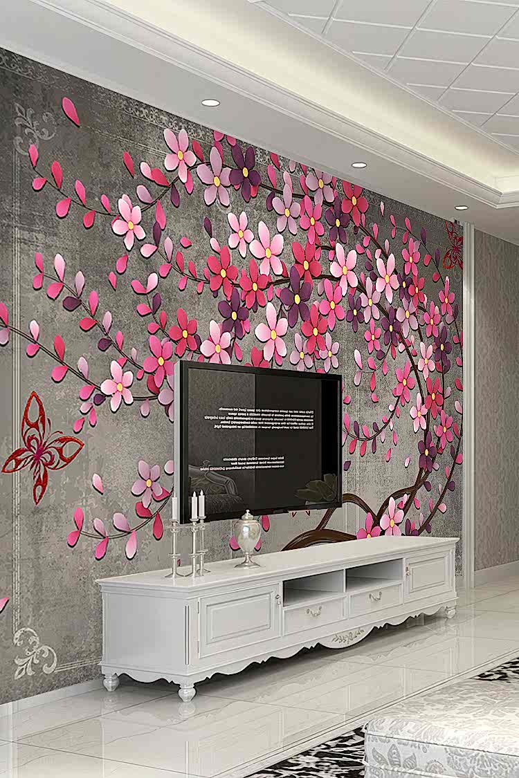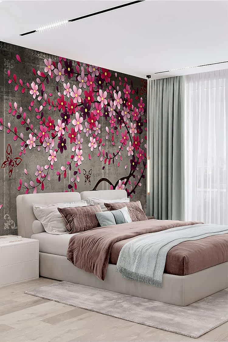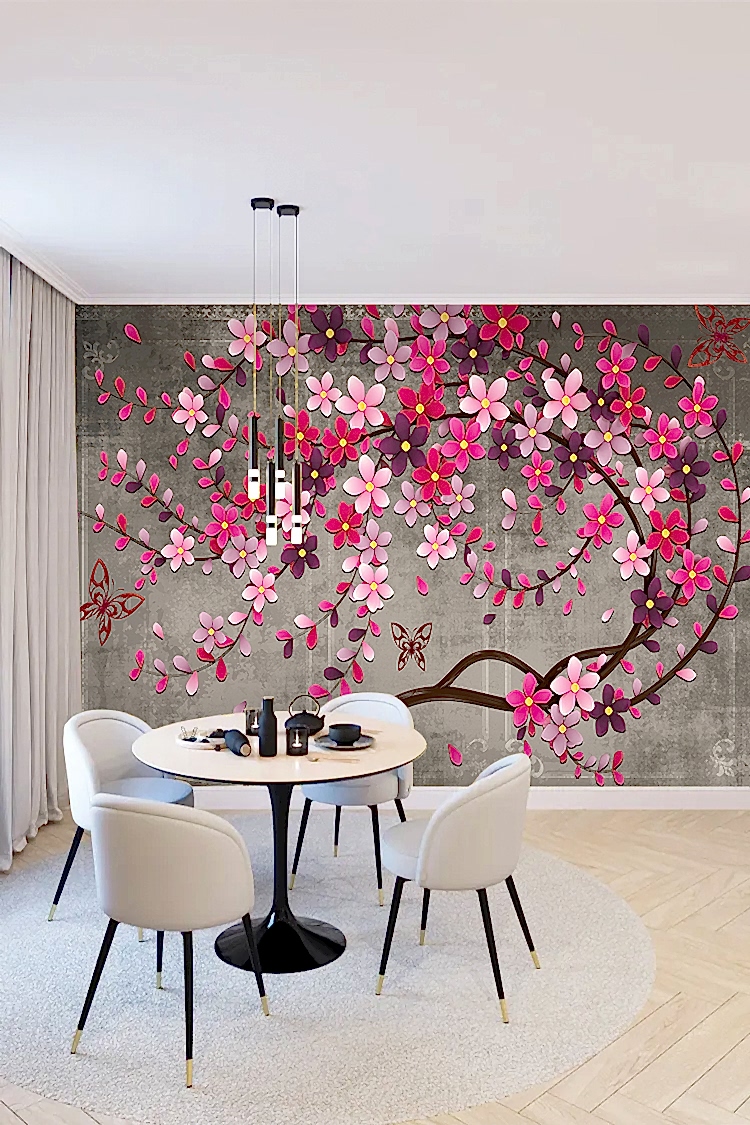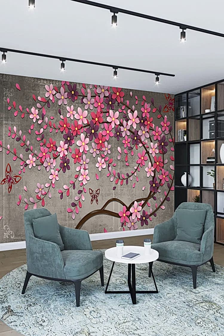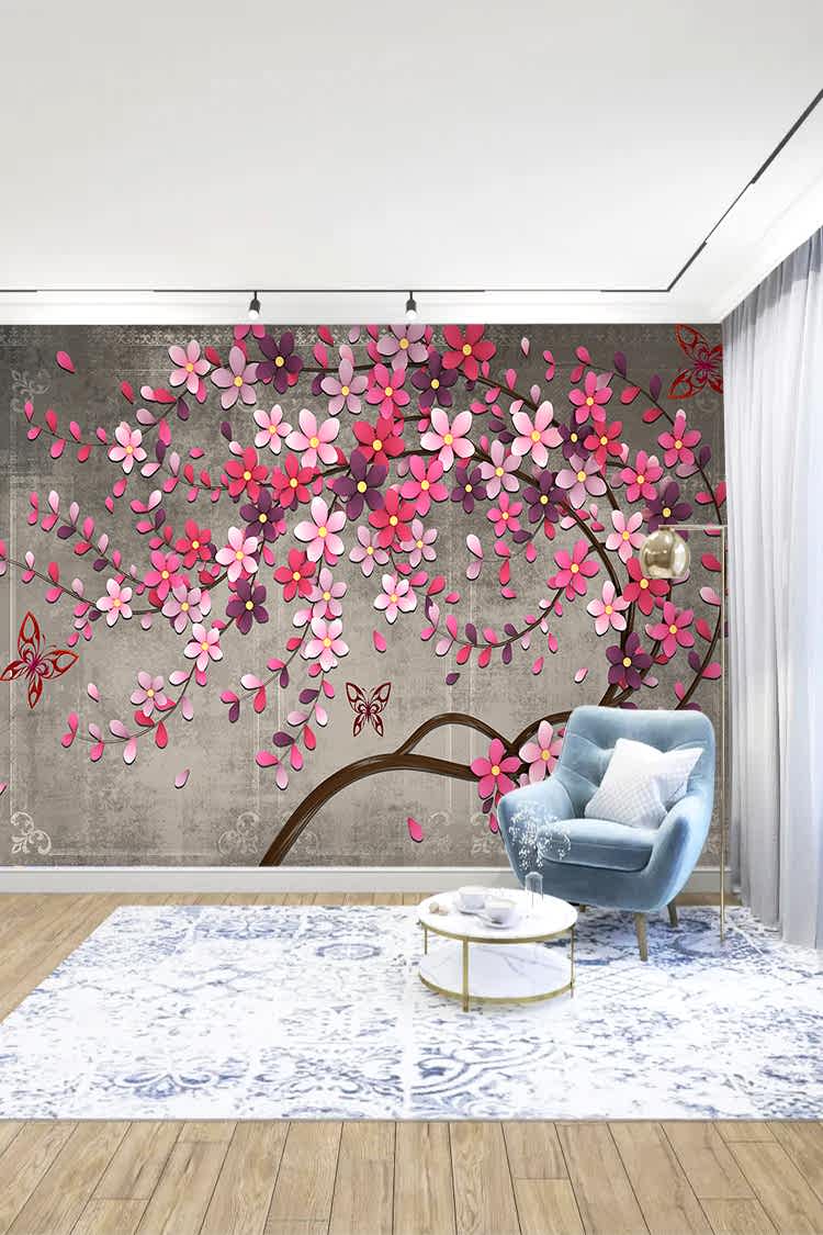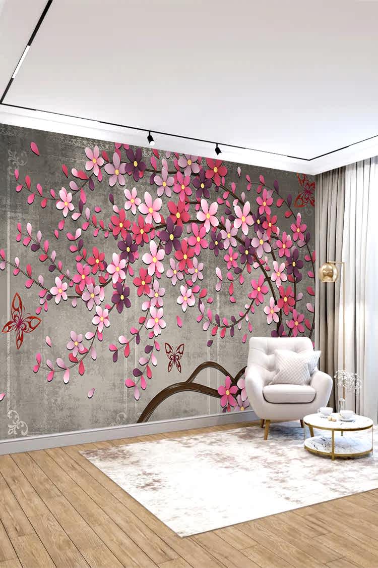 Pembe Çiçek ve Kelebek Desenli Şık Duvar Kağıdı