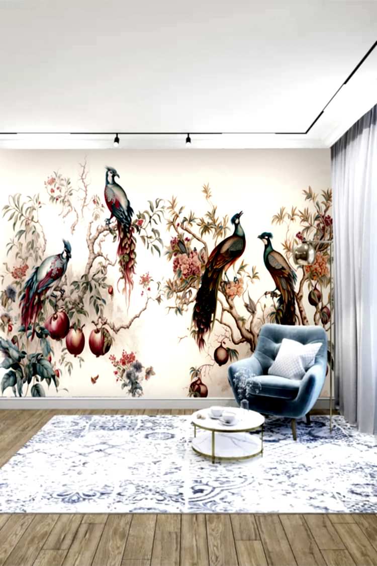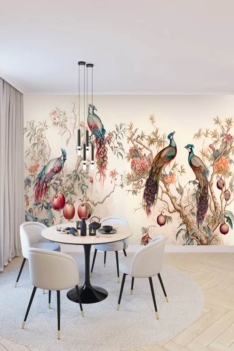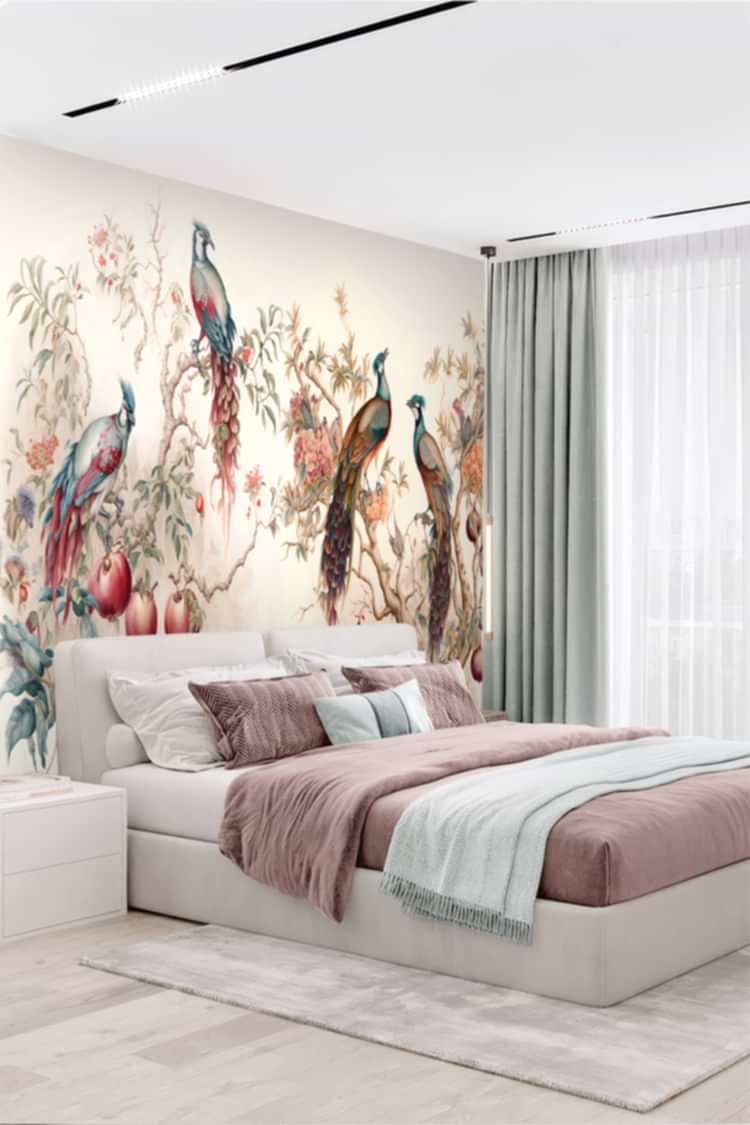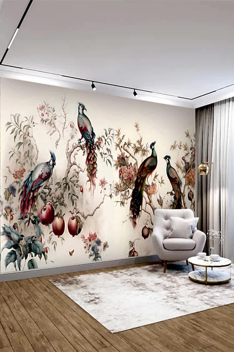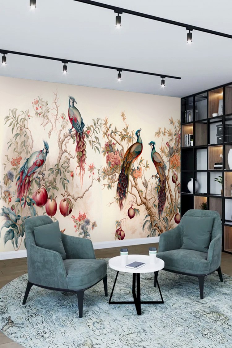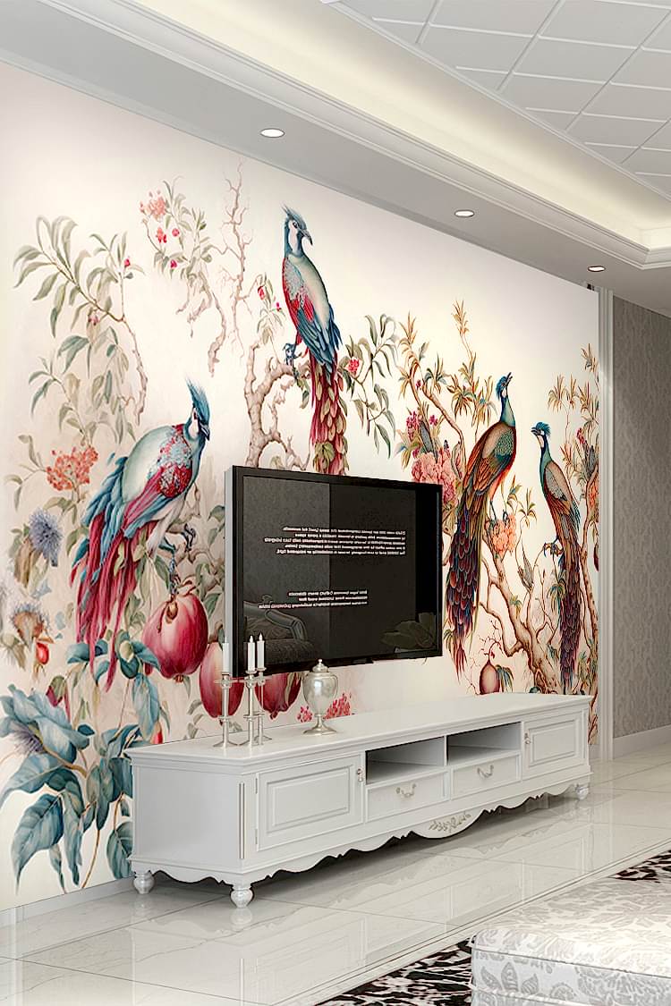 Renkli Tavus Kuşları ve Çiçeklerle Duvar Kağıdı
