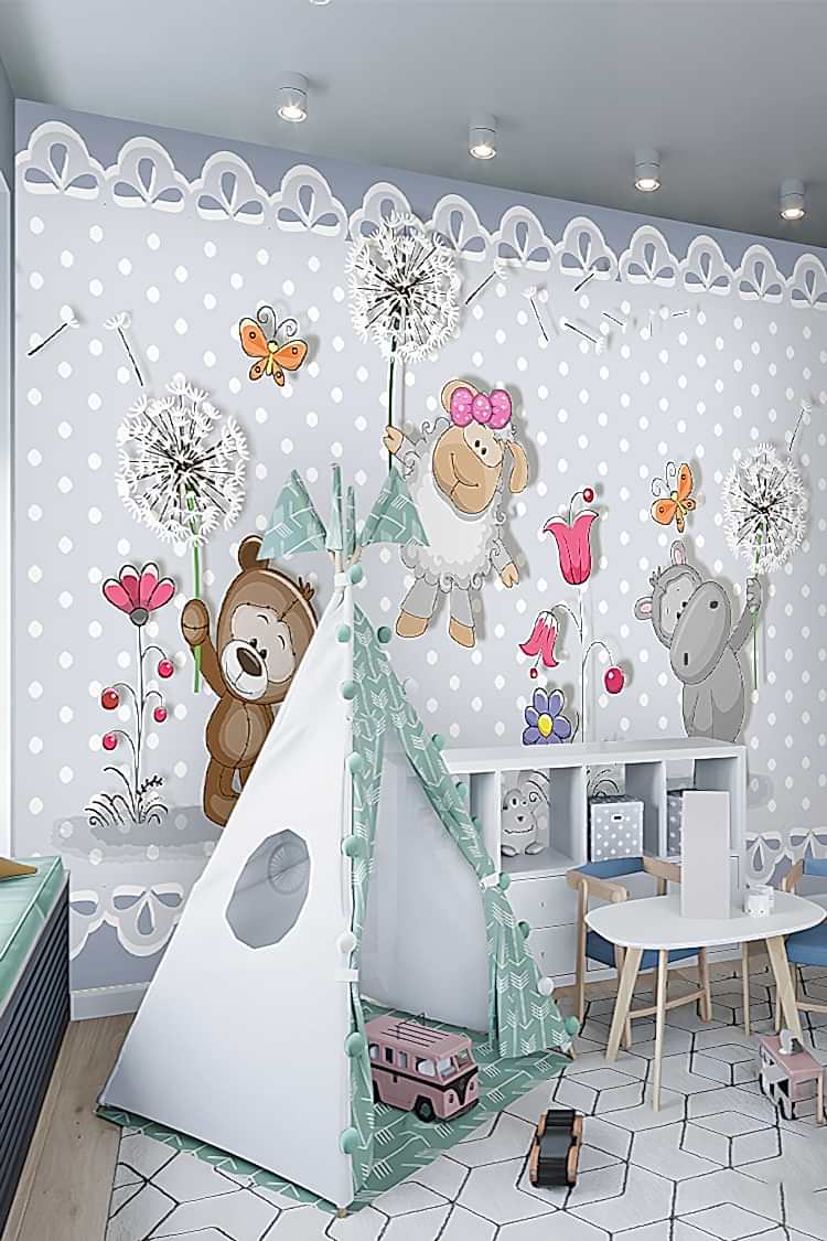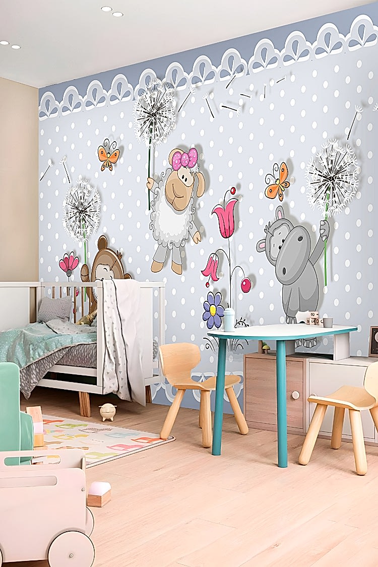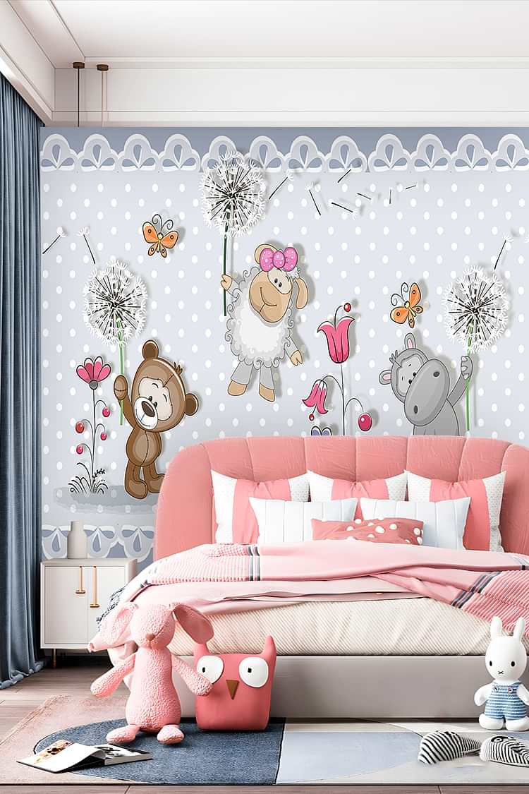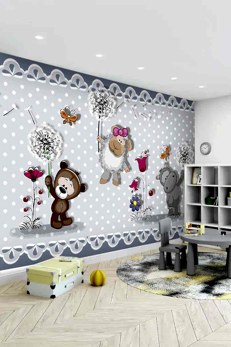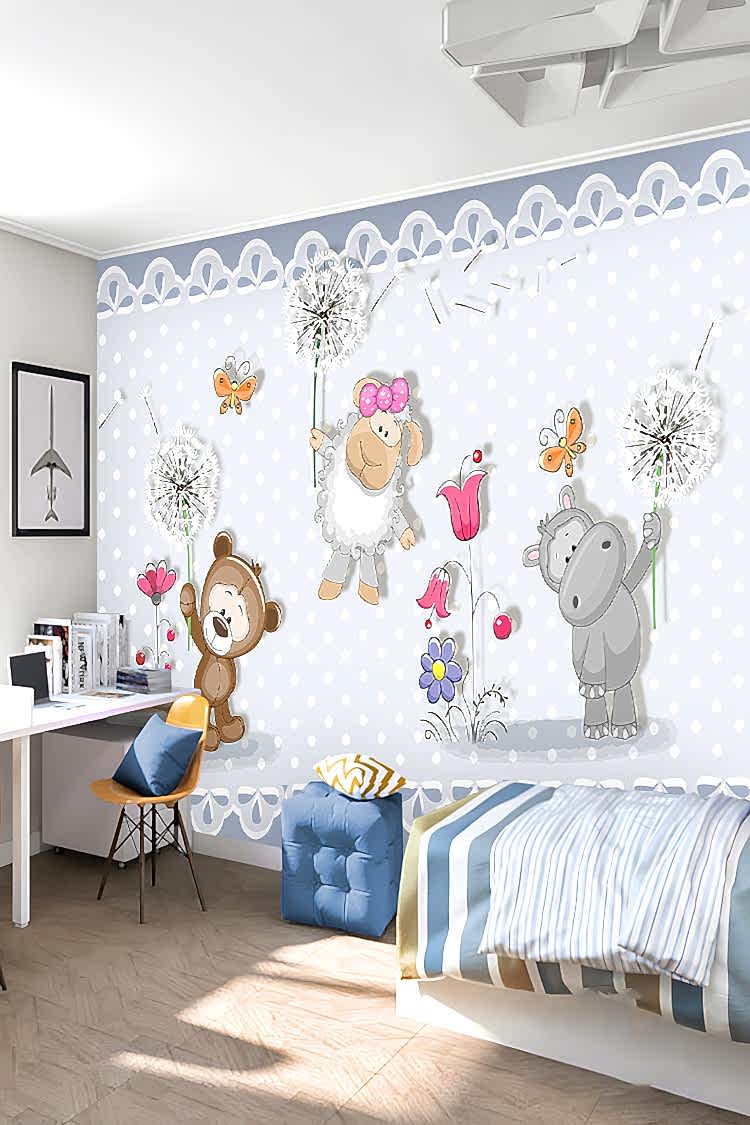Sevimli Ayıcık ve Hayvanlar Desenli Çocuk Duvar Kağıdı
