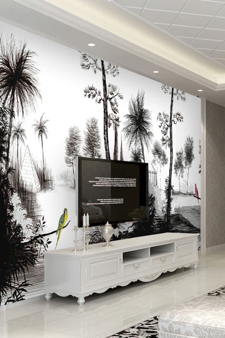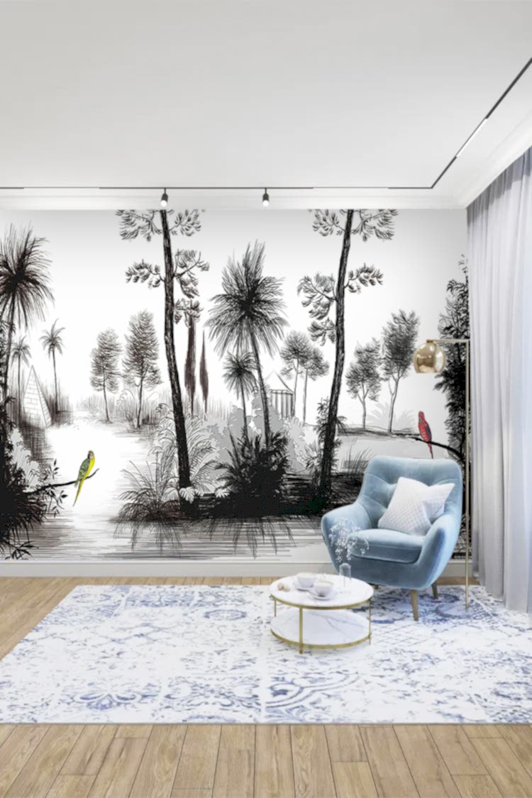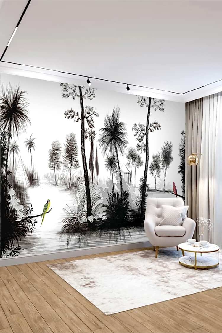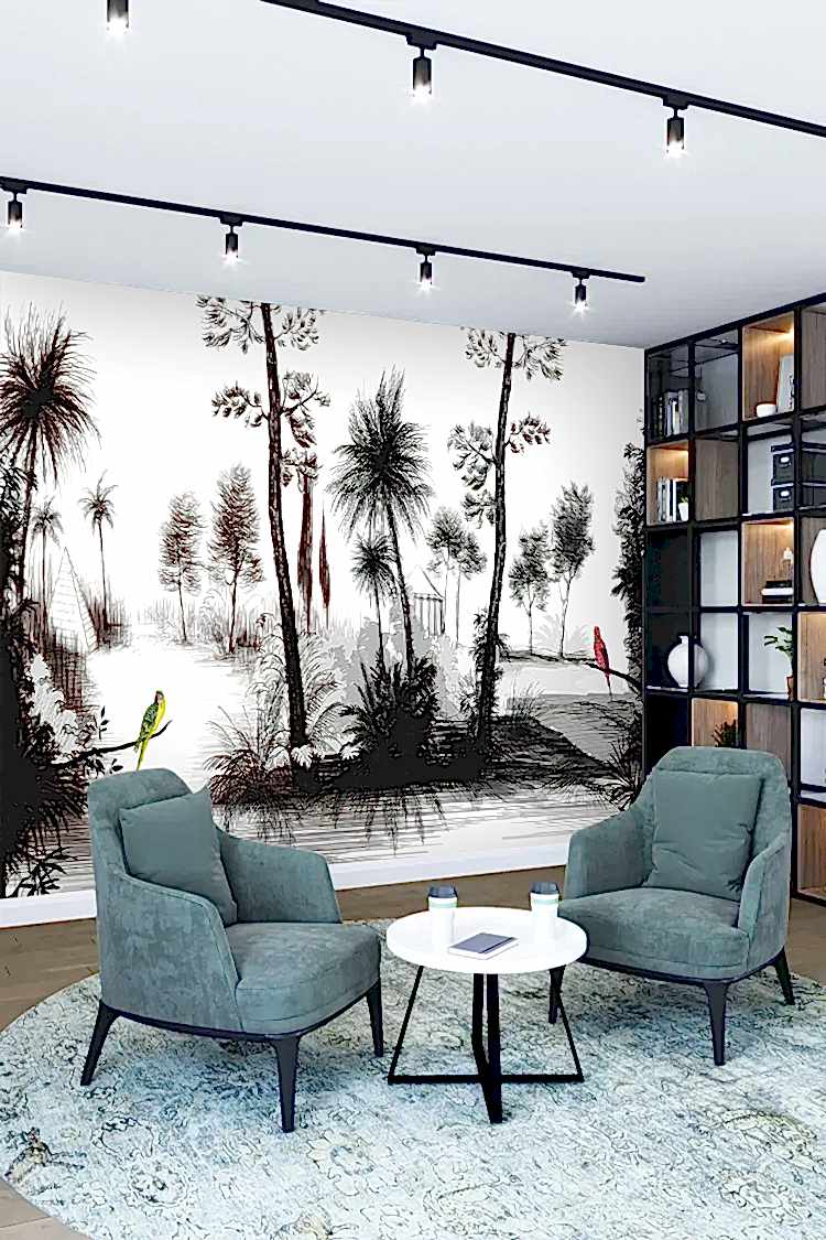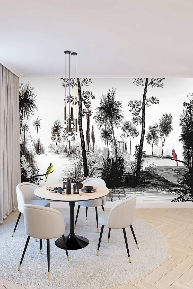 Siyah Beyaz Tropikal Ağaç ve Kuşlu Duvar Kağıdı