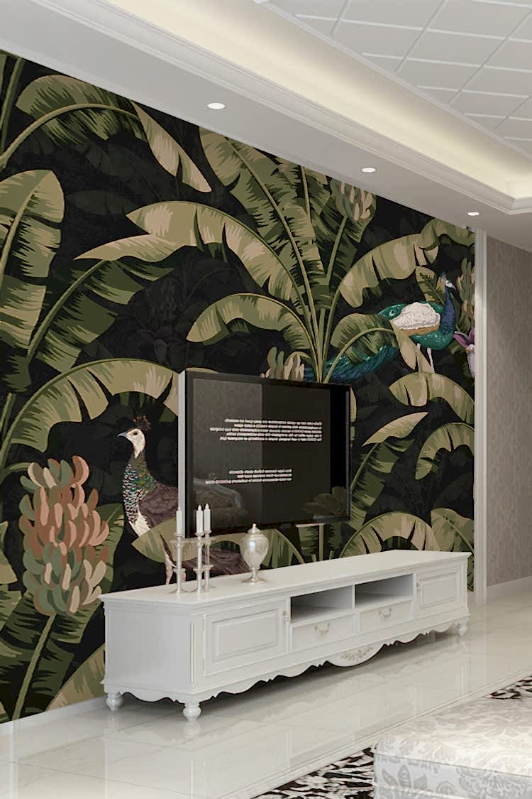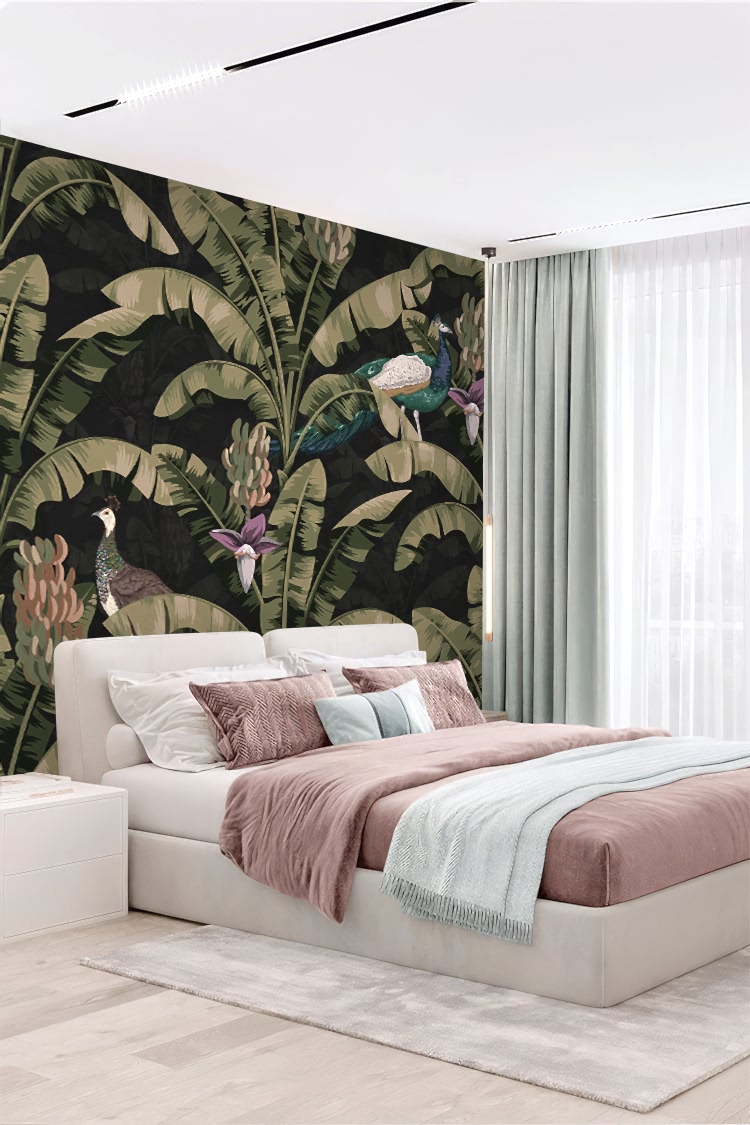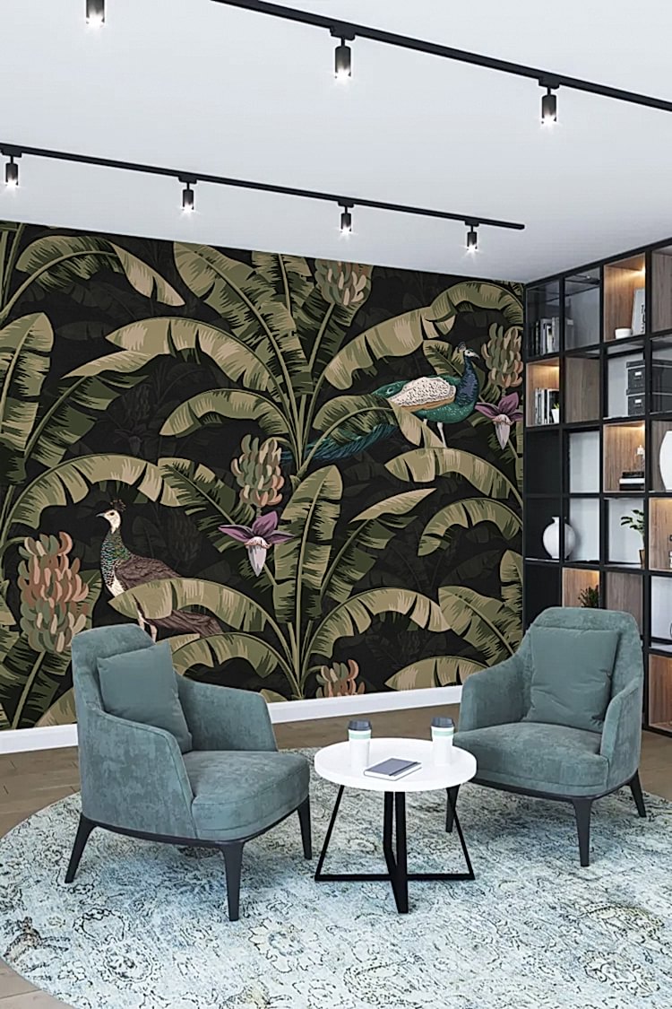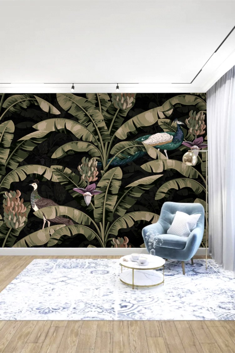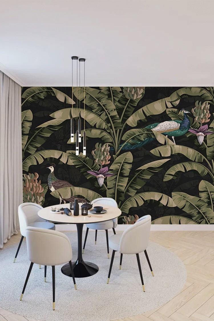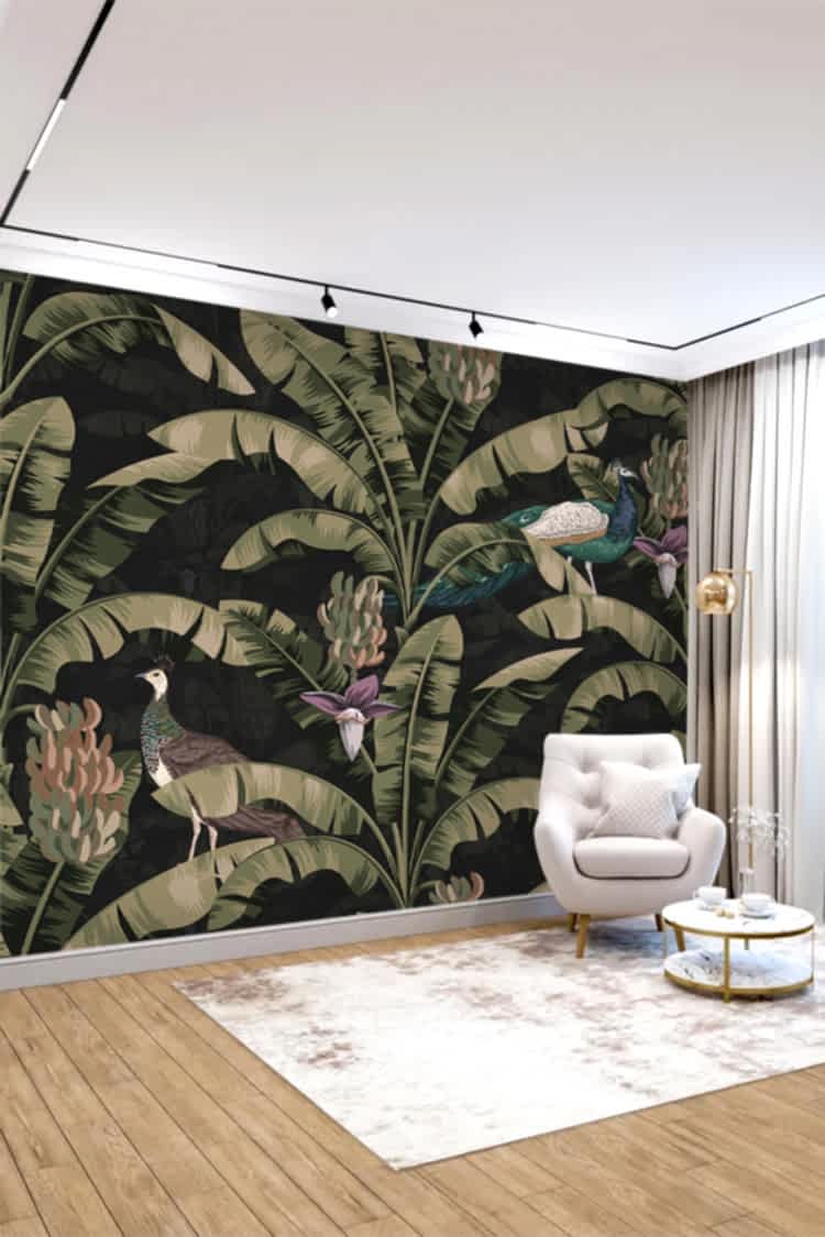 Tavuskuşları ve Tropikal Bitkilerle Koyu Tonlu Duvar Kağıdı