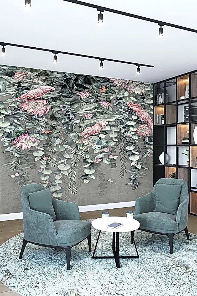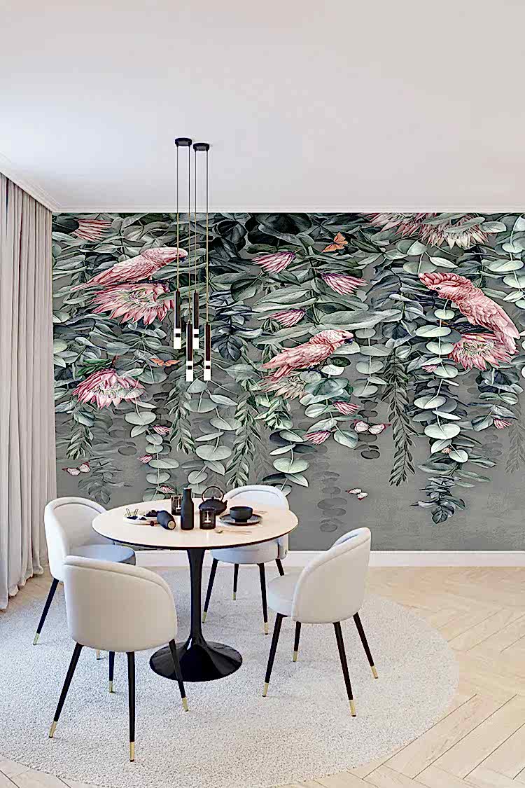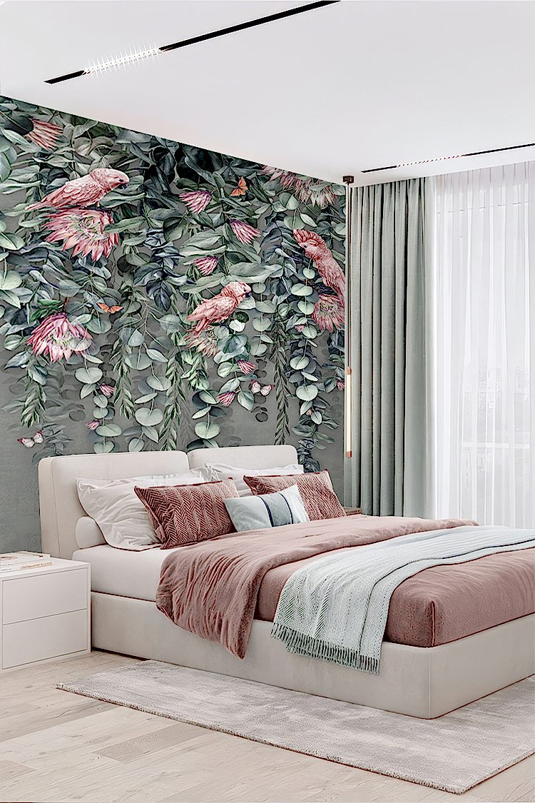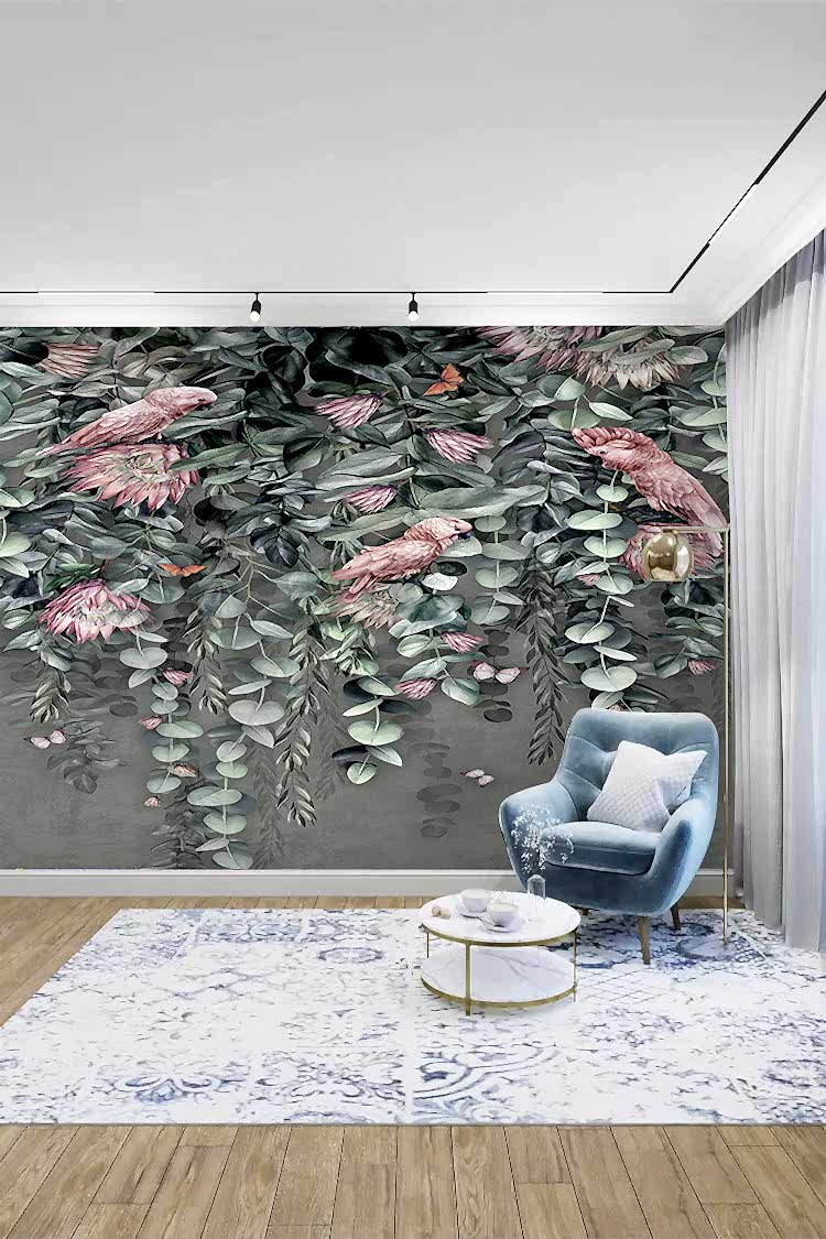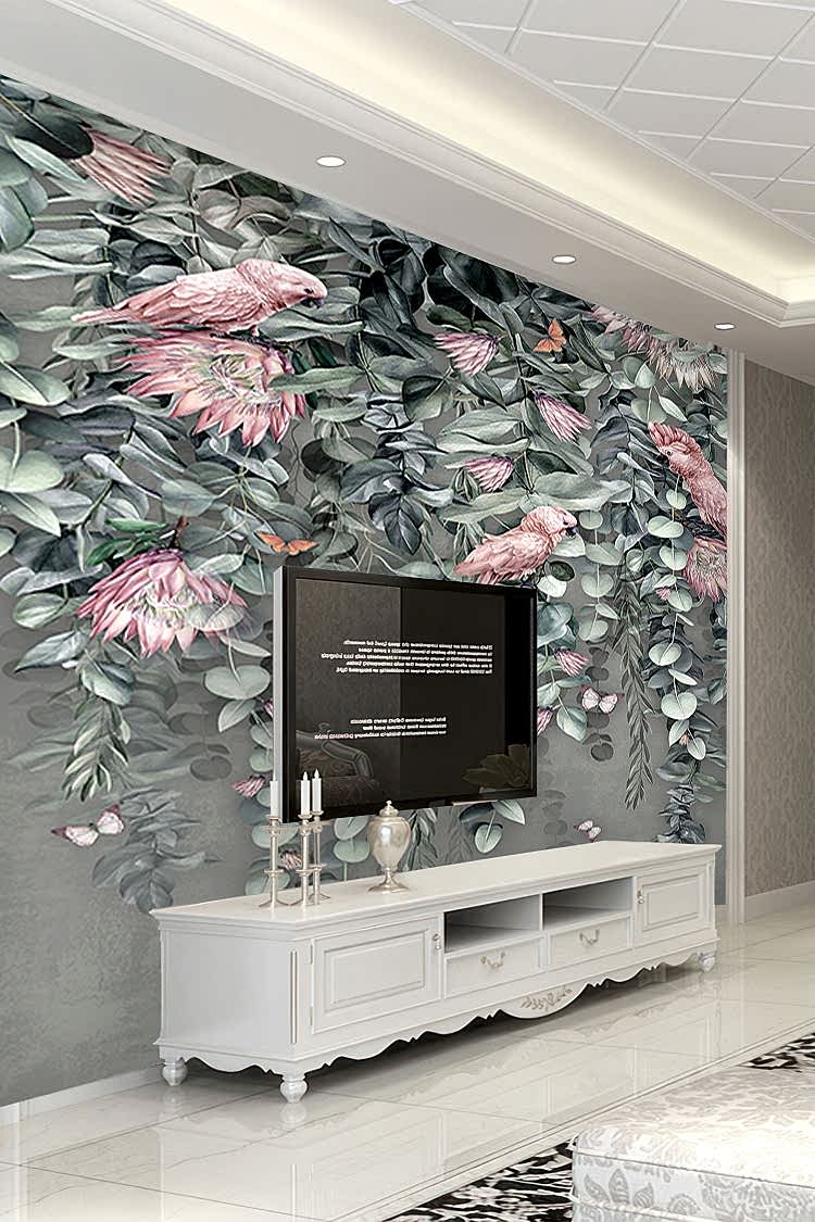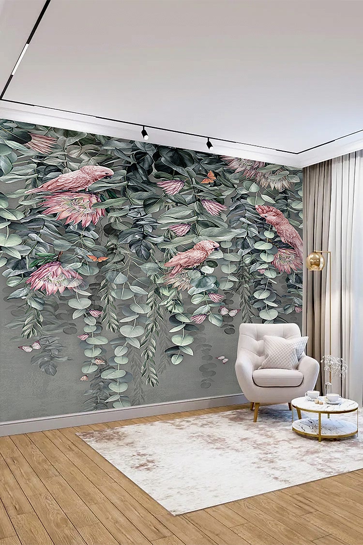 Tropikal Çiçek ve Kuş Desenli Duvar Kağıdı