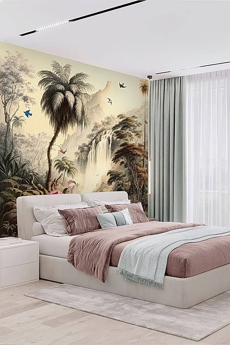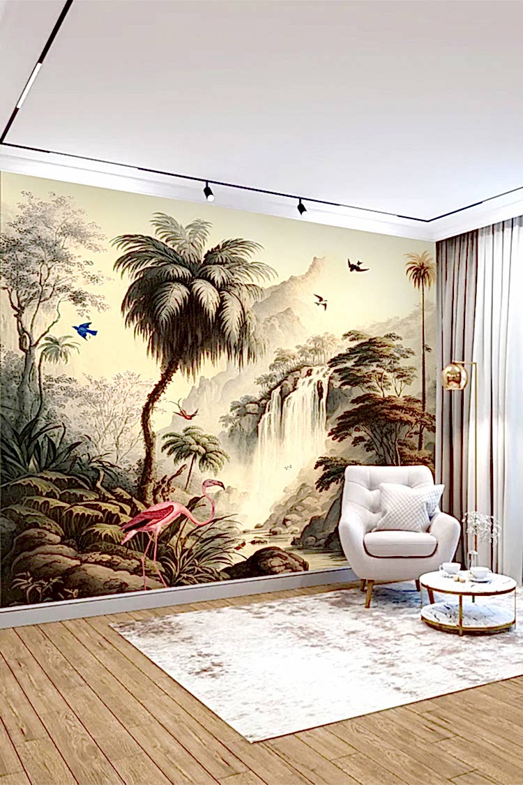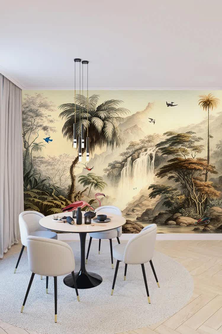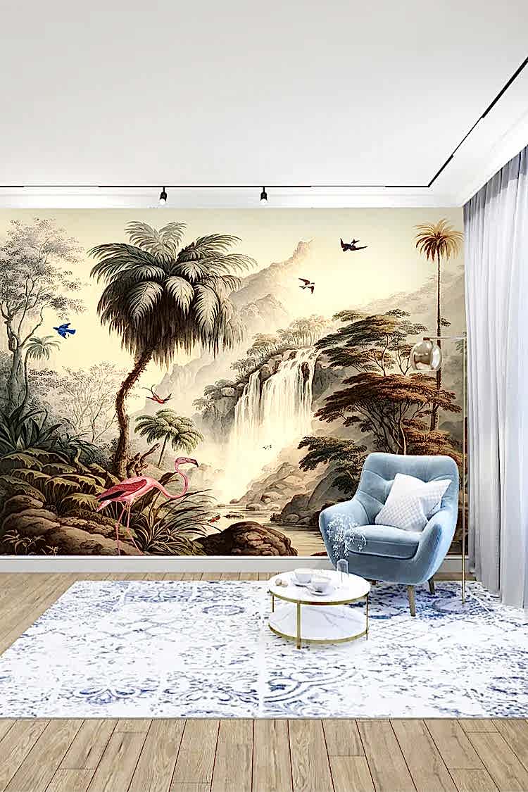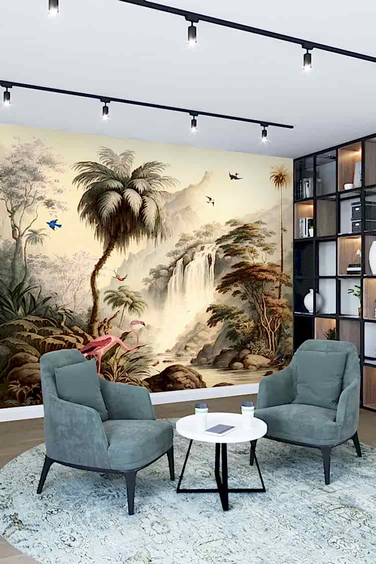 Tropikal Şelale ve Flamingolarla Duvar Kağıdı
