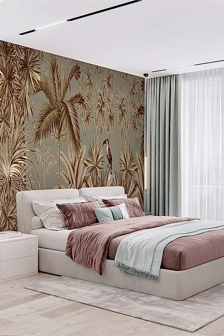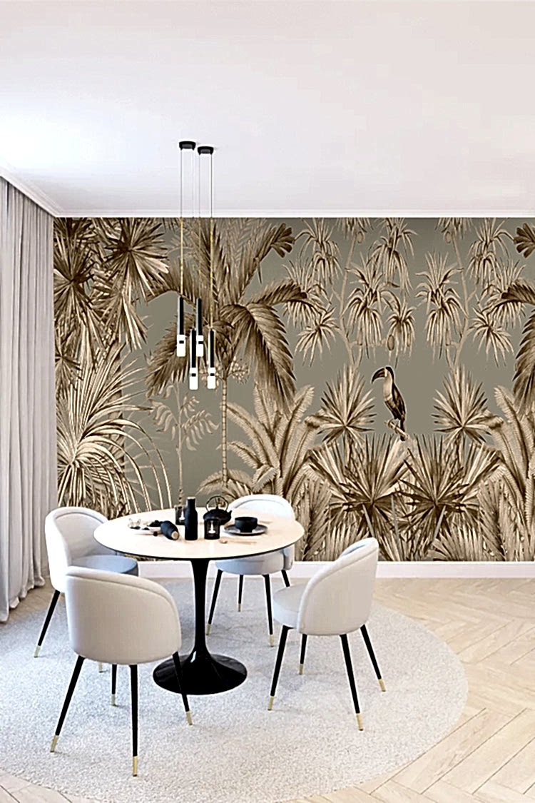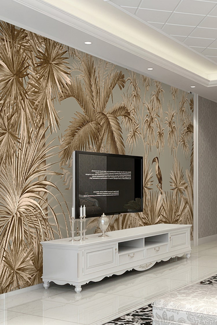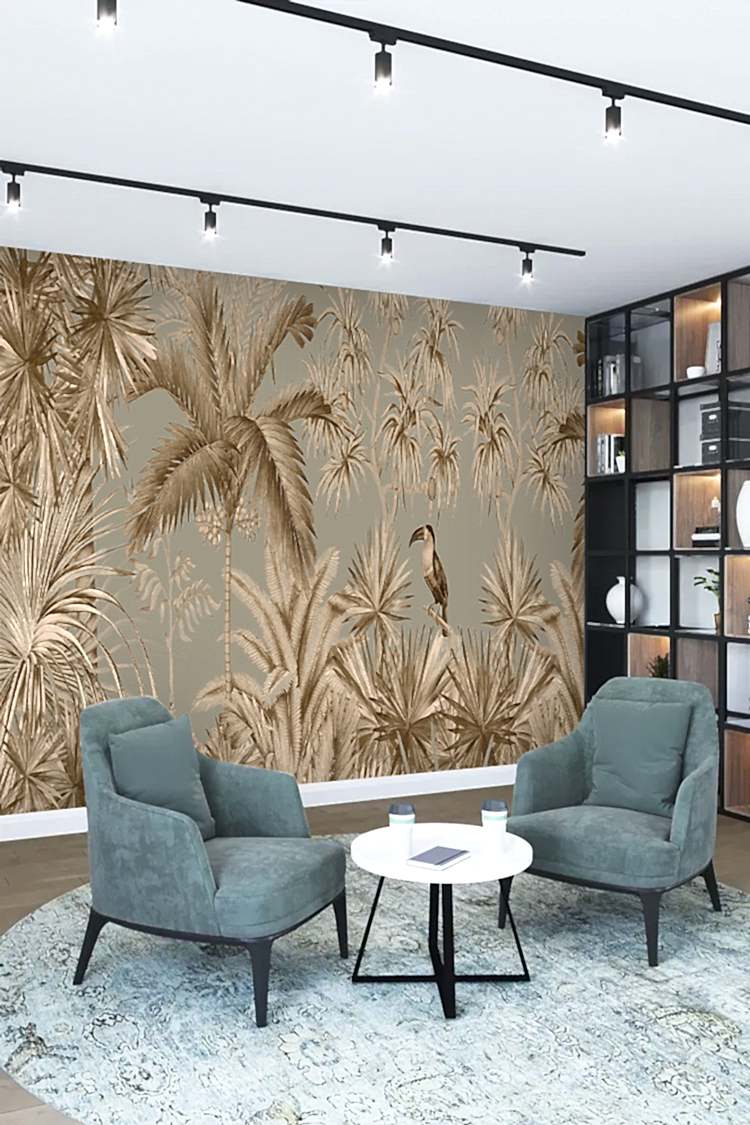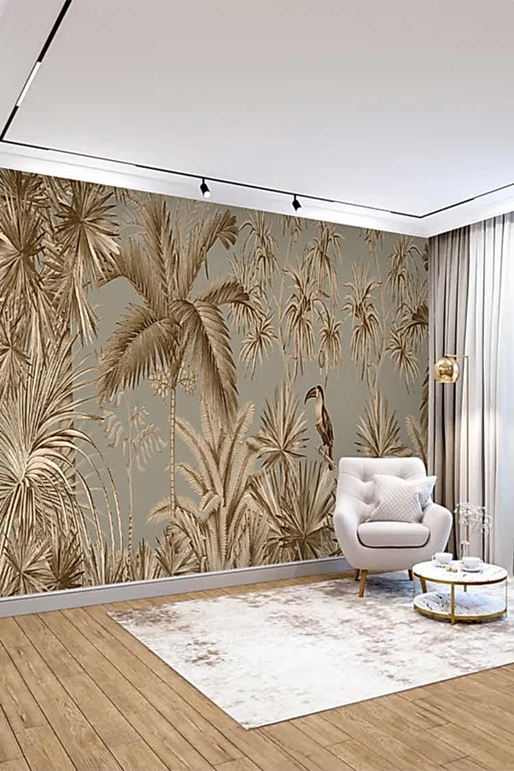 Vintage Tropikal Palmiye ve Kuş Desenli Duvar Kağıdı